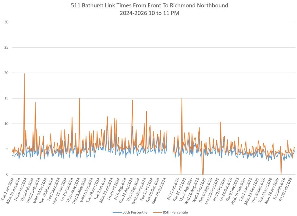 These charts show the overall times between Front and Bloor where the cumulative effect, if any, over the smaller segments should show up. The period from November 2024 to June 2025 is omitted because there was no continuous service between these points during that period. Some reduction is visible in late 2025 in the median values, but not much. The greater effect is in trimming the peaks, although this could partly be masked by weather-related delays.