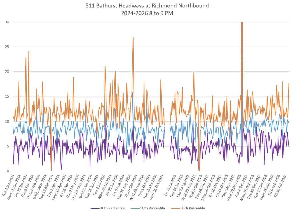 Another important point is that delays and irregularity are not just a peak period issues, but can affect service at midday and through the evening. (This can also affect weekends, but I have not included them here.) On 511 Bathurst, there is a quite striking “heartbeat” pattern with extended travel times almost always on Friday evenings on the south end of the route due to congestion in the Entertainment District. This substantially disappeared after the implementation of red lanes in the area.