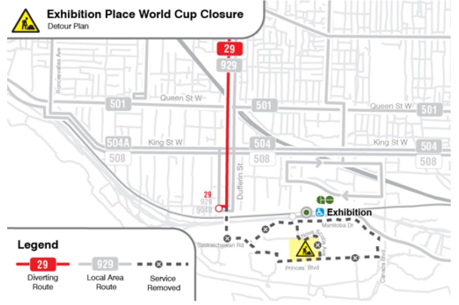 Service through Exhibition Place to Princes Gates Loop will be suspended on 29 Dufferin. Night service will take an alternate route north of the closed area.