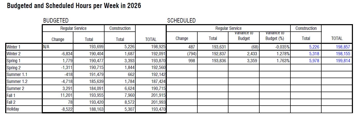 There is no change in the scheduled travel time in most periods. The round trip times will be set at 90 minutes (down from 98) on weekend service early morning and through the evening including the extended hours.
