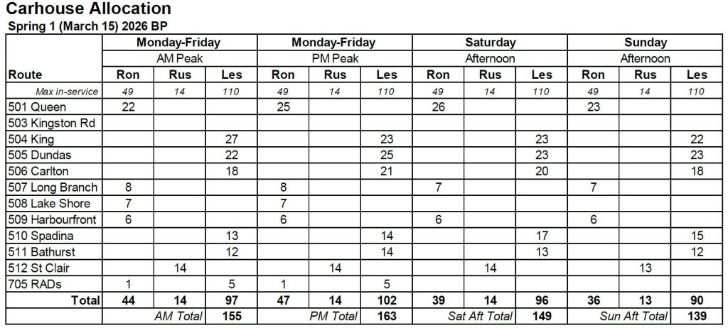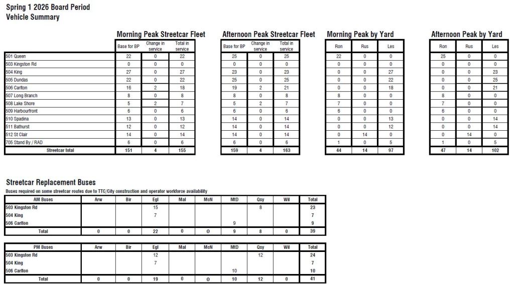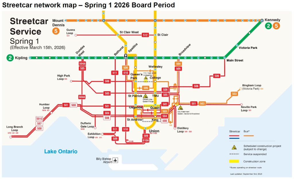 Diversion of routes 501 Queen, 503 Kingston Road and 504 King for construction on Queen west of Broadview continues. Judging by recent state of the work, the diversion could end well before the announce late April date, but the bus substitutions will not change until the next schedules at the start of May. This diversion began on February 23.