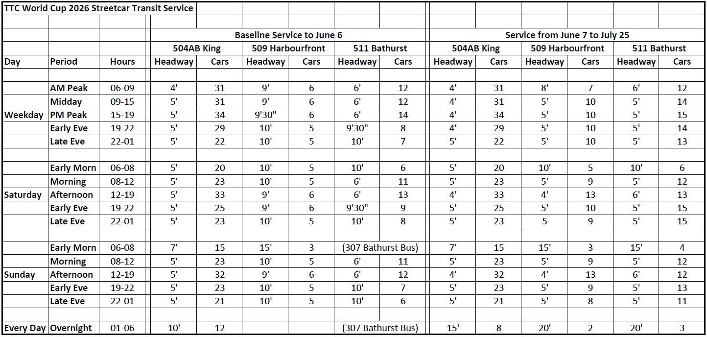 The scheduled streetcar services will be improved beyond what is normally provided. Additional service will operate on game days. The values below are from the Mobility Plan and have not yet been confirmed by the TTC.