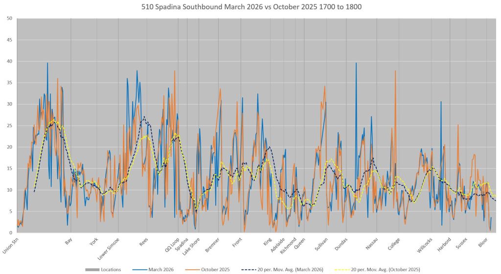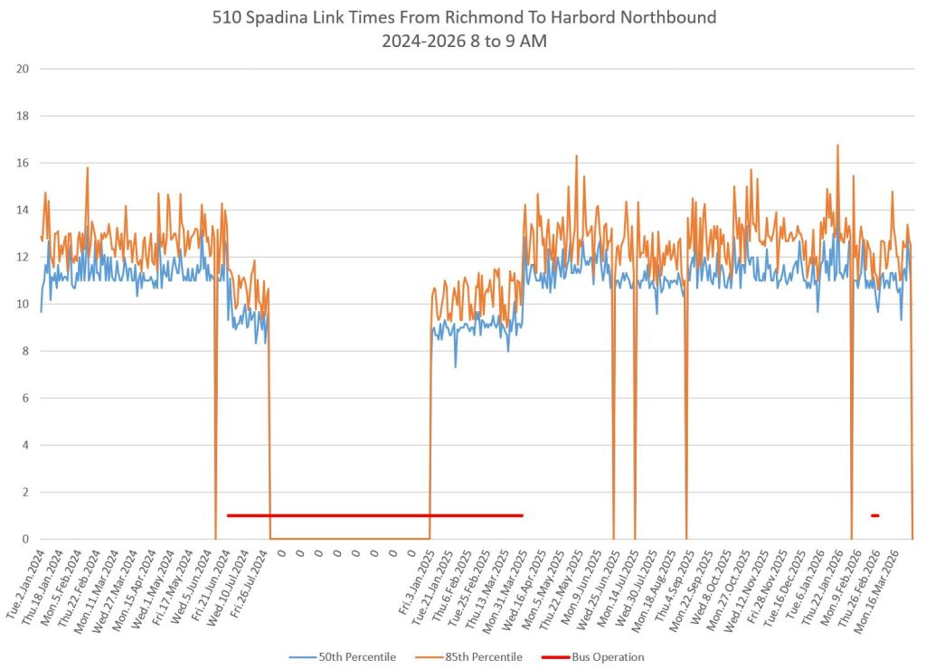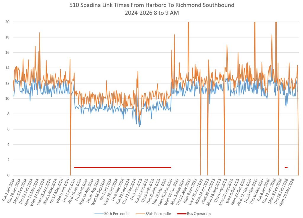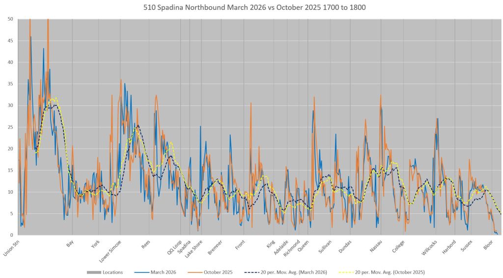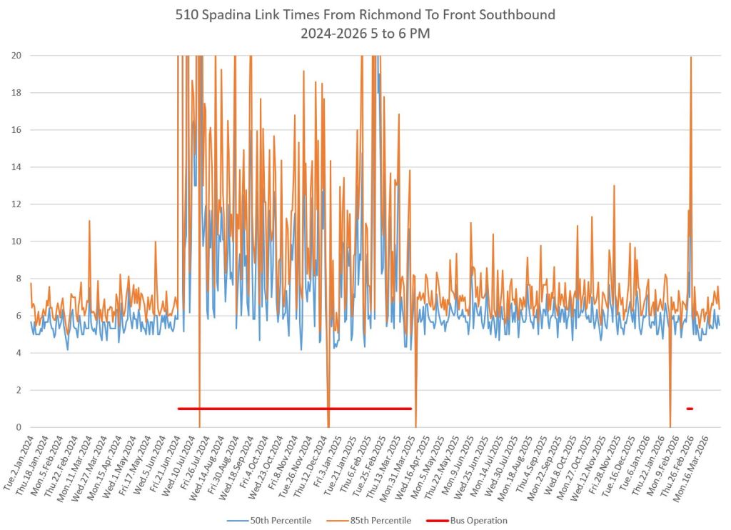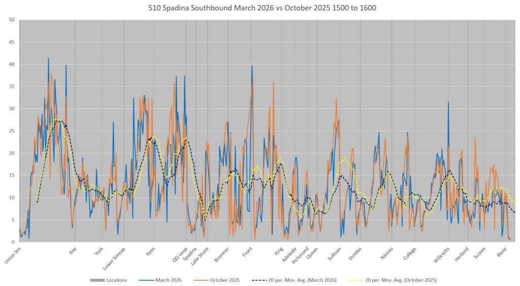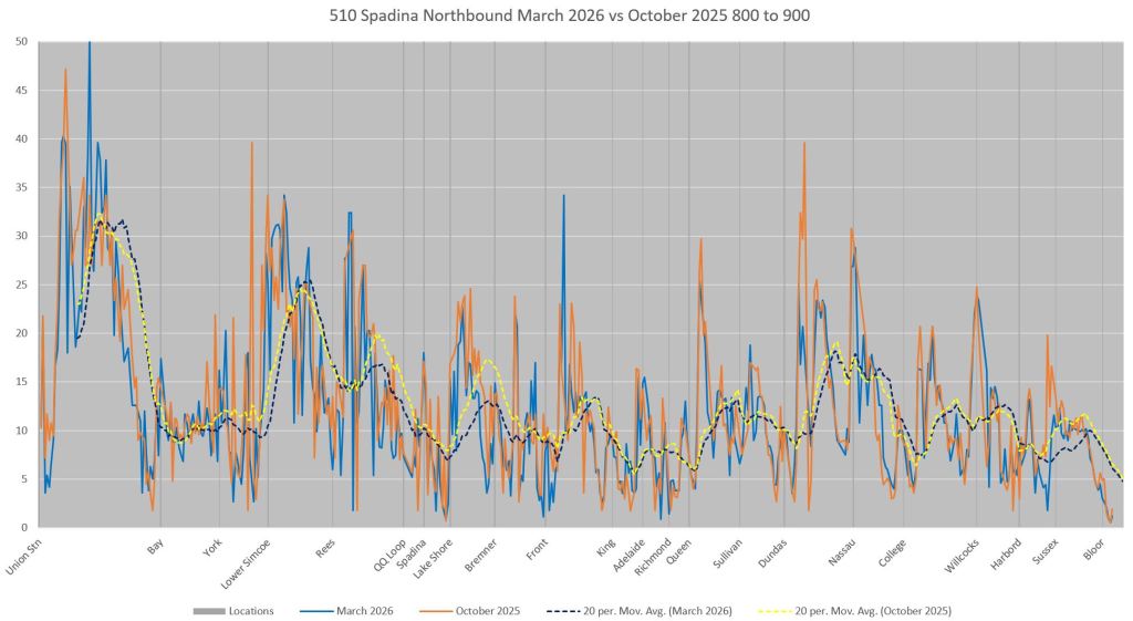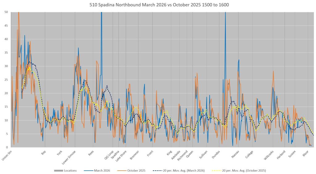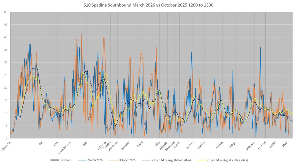 This article includes data from January 2024 through March 2026 showing travel times on Spadina. Also included are comparisons of speeds and dwell times along the route from October 2025 and March 2026.