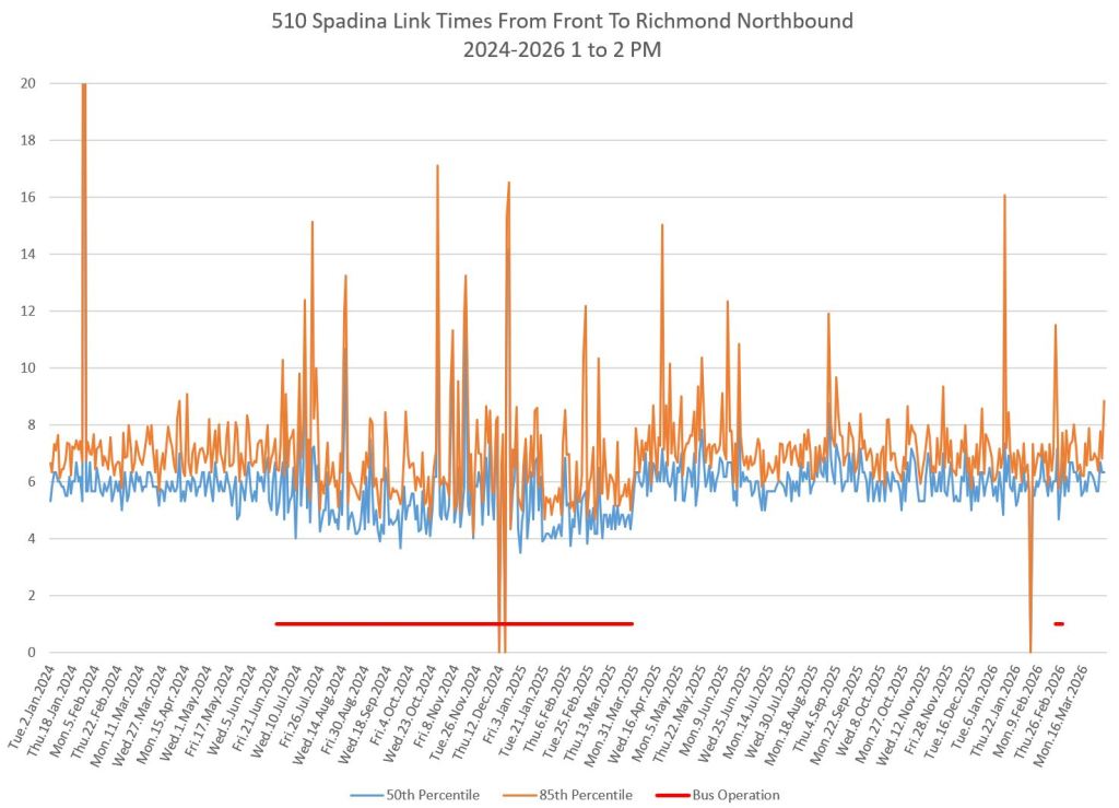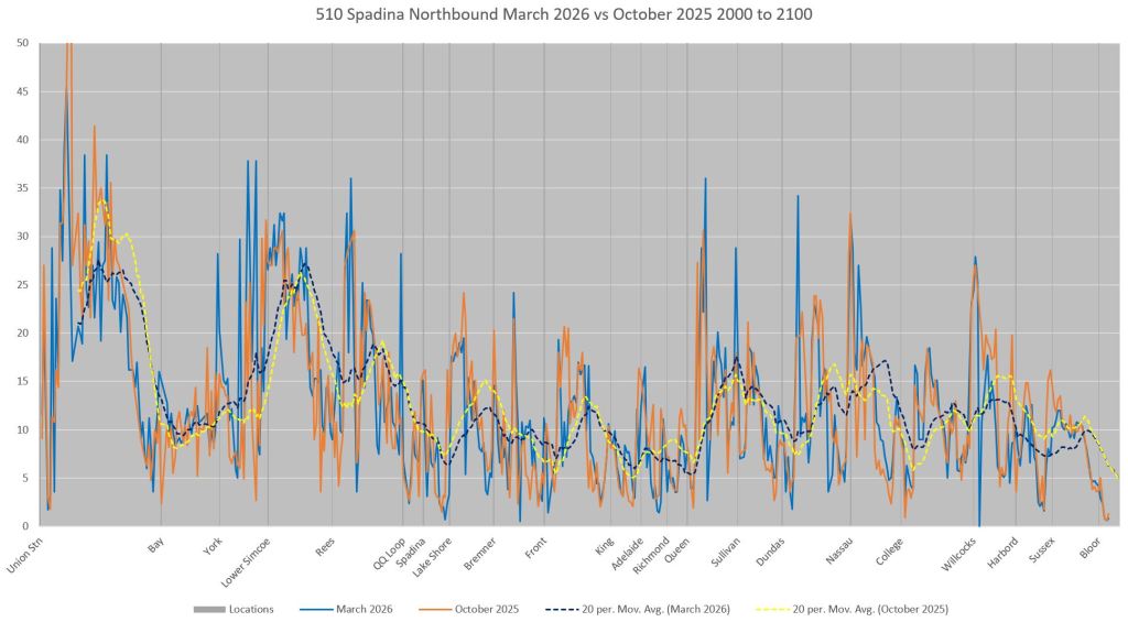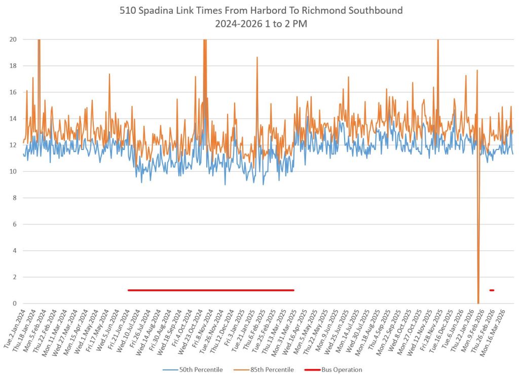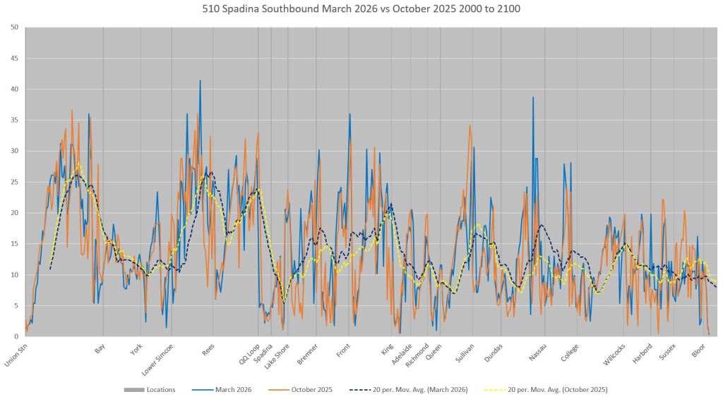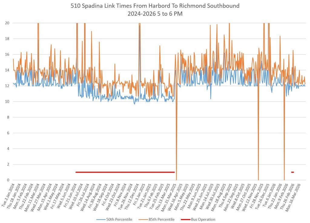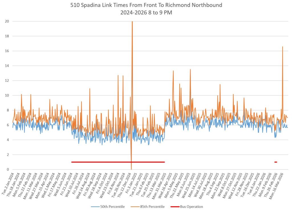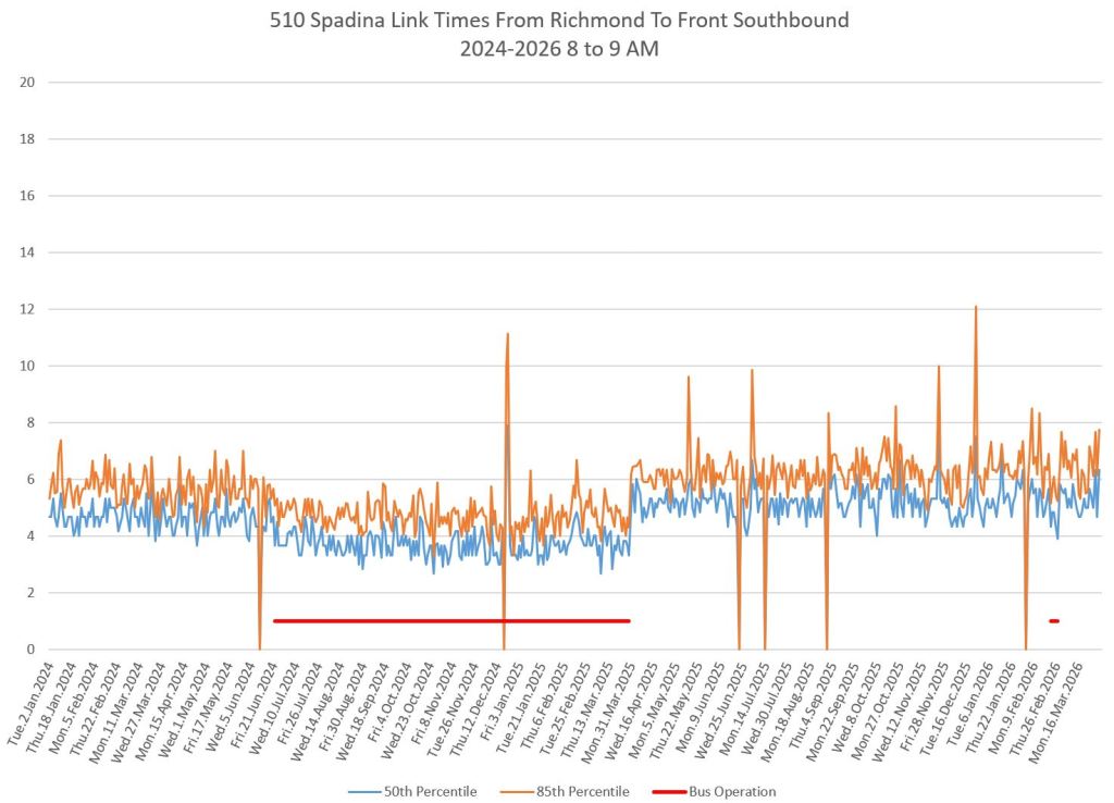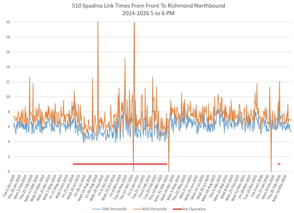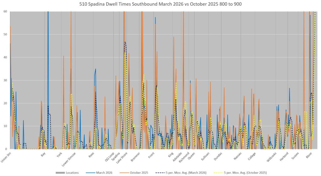 This article includes data from January 2024 through March 2026 showing travel times on Spadina. Also included are comparisons of speeds and dwell times along the route from October 2025 and March 2026.