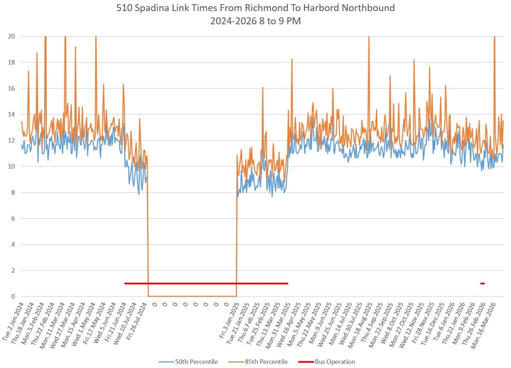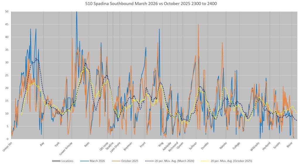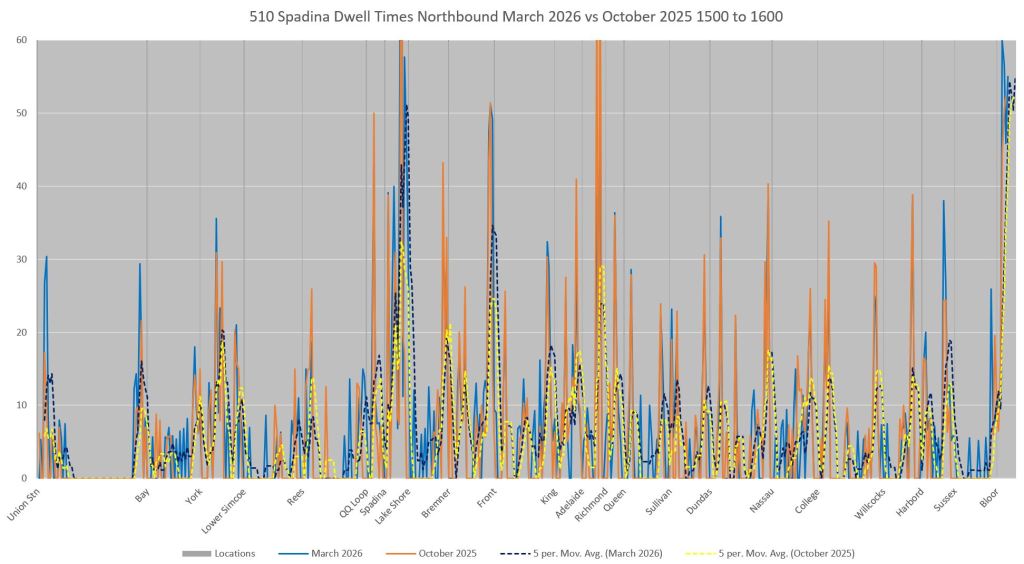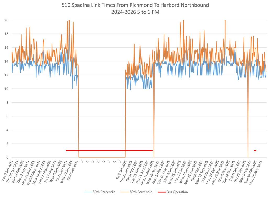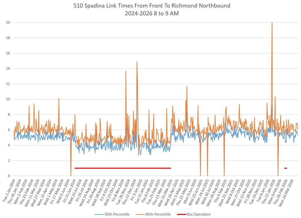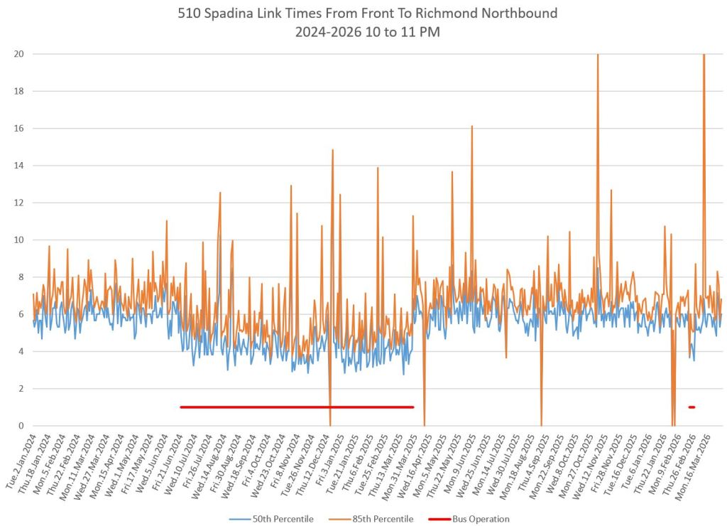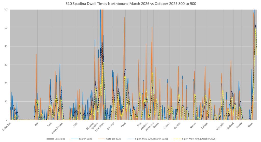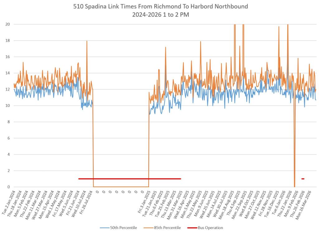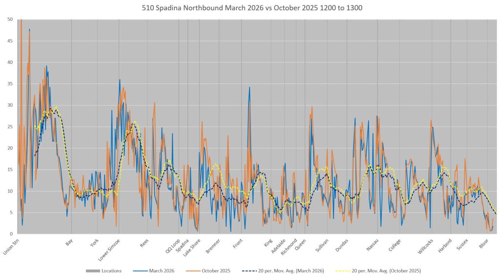 This article includes data from January 2024 through March 2026 showing travel times on Spadina. Also included are comparisons of speeds and dwell times along the route from October 2025 and March 2026.