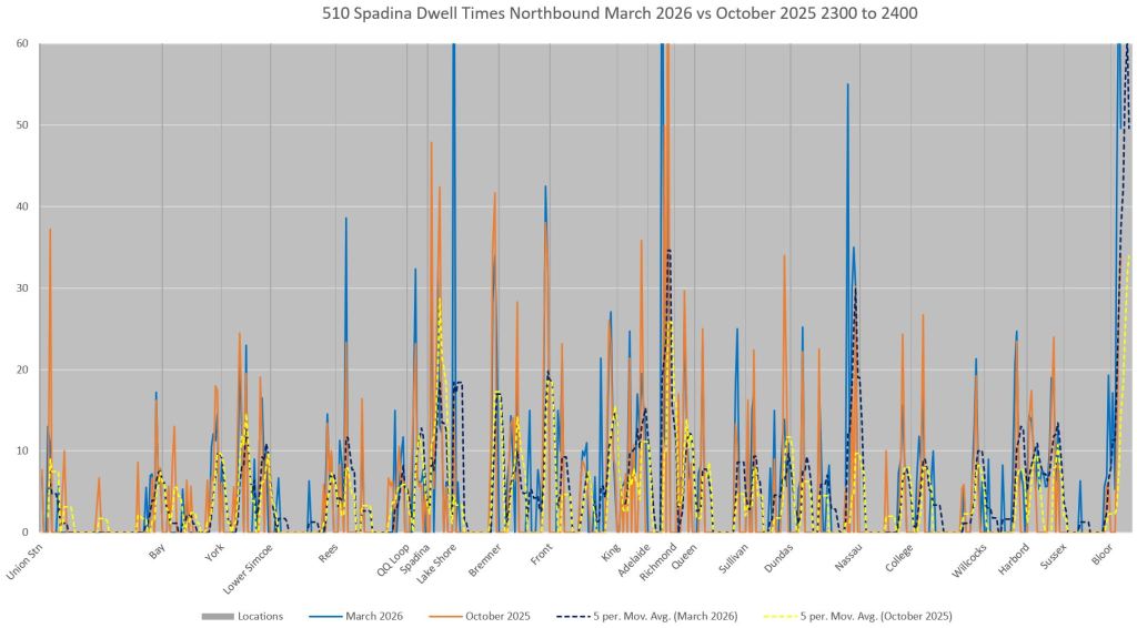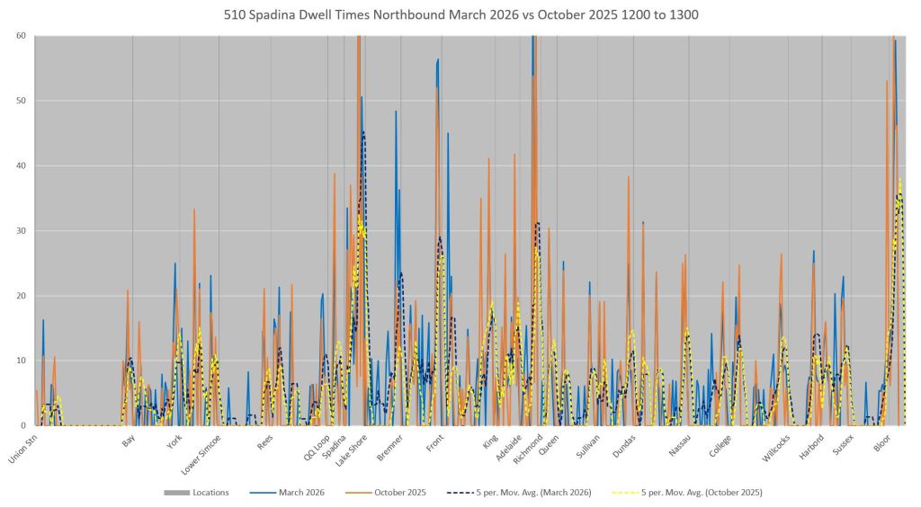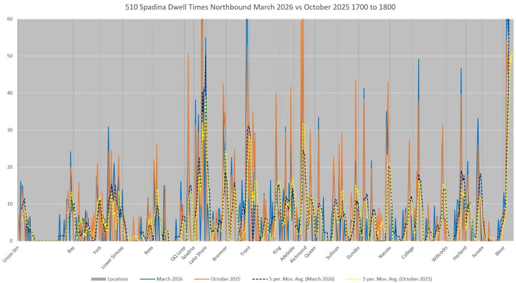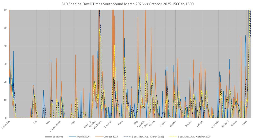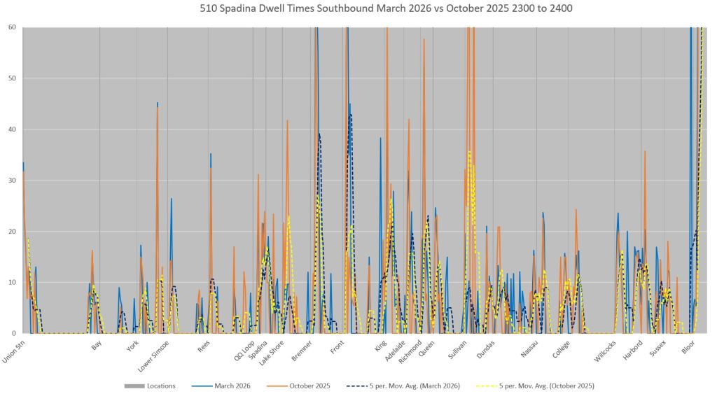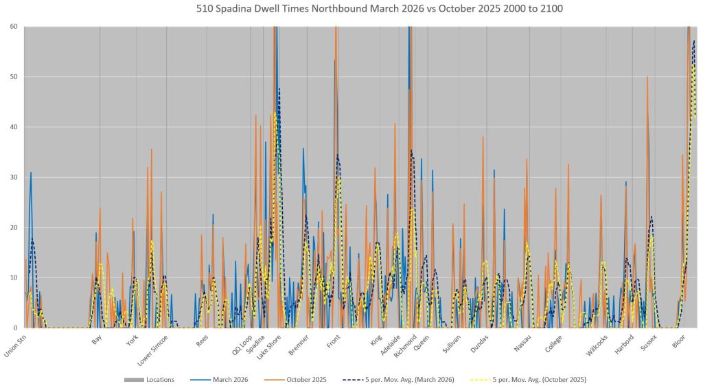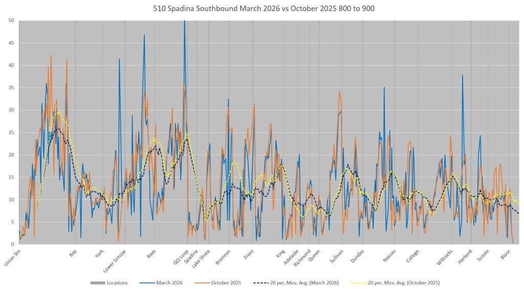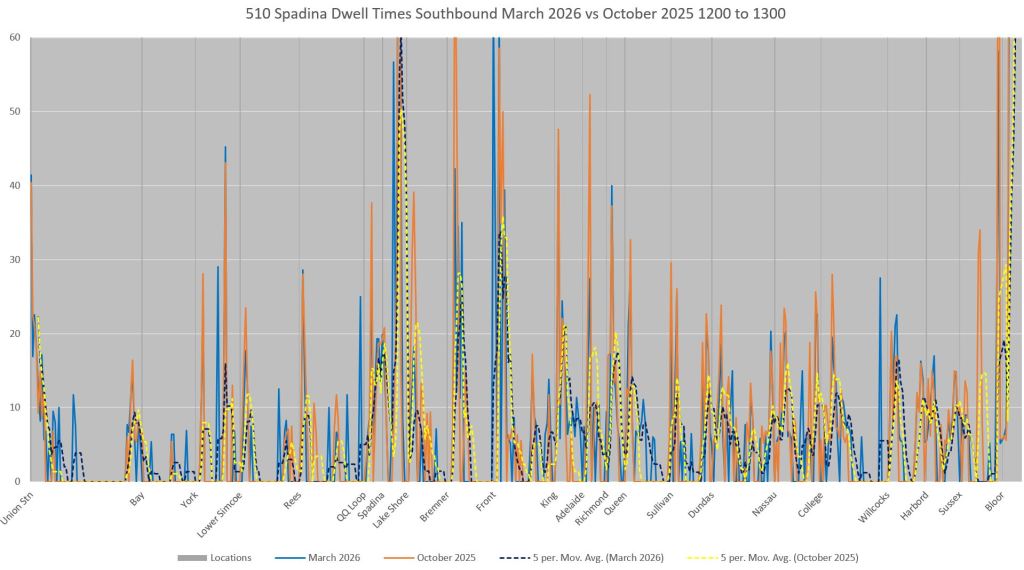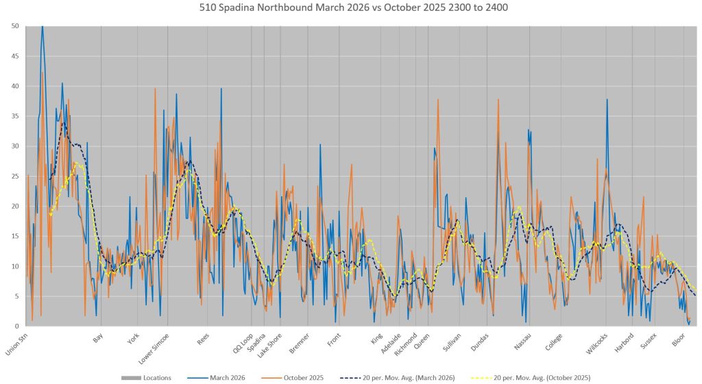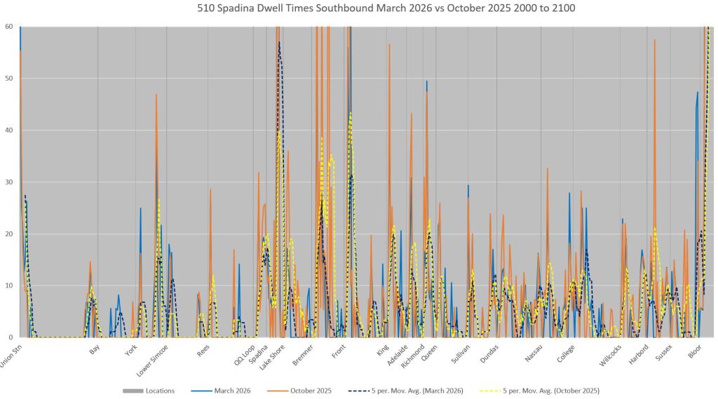 This article includes data from January 2024 through March 2026 showing travel times on Spadina. Also included are comparisons of speeds and dwell times along the route from October 2025 and March 2026.
