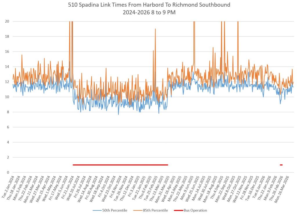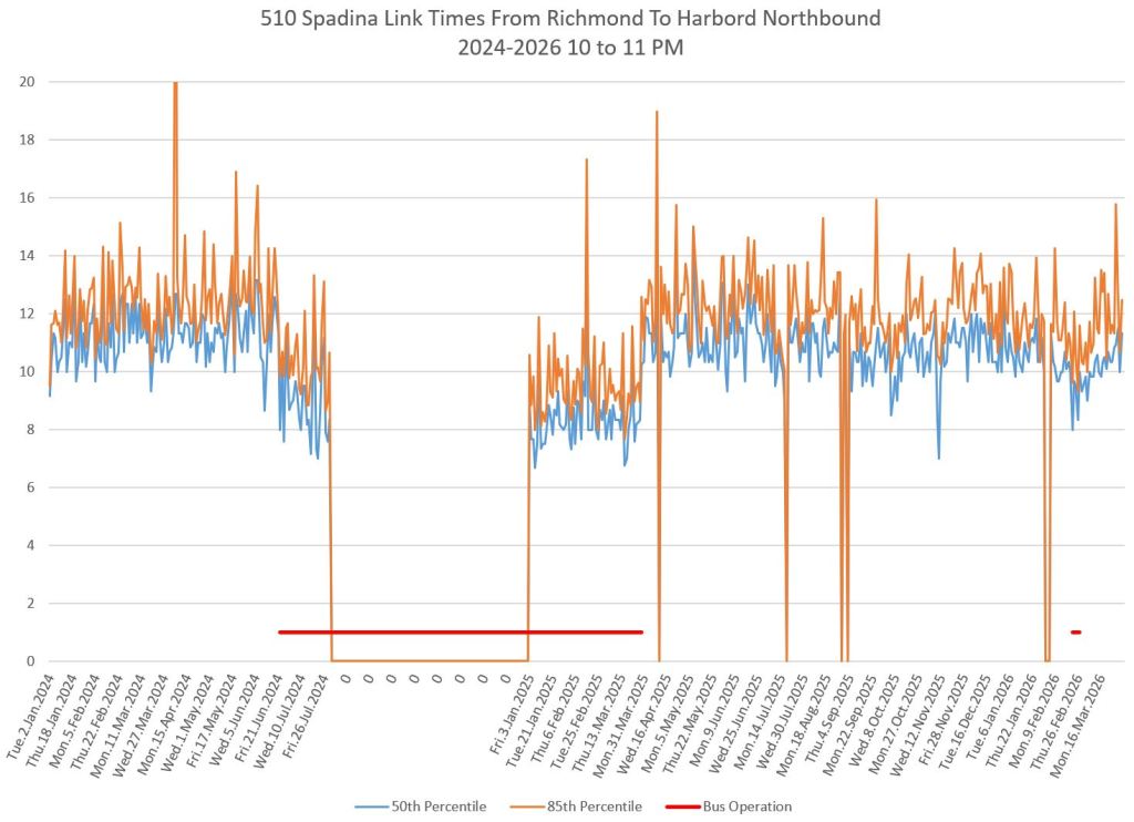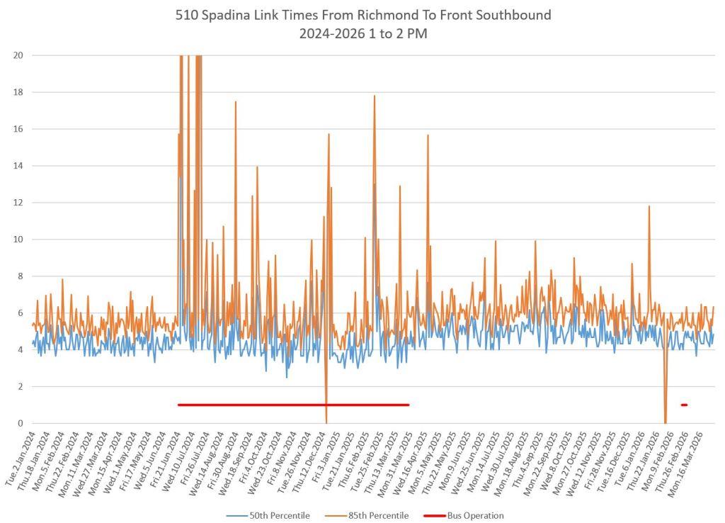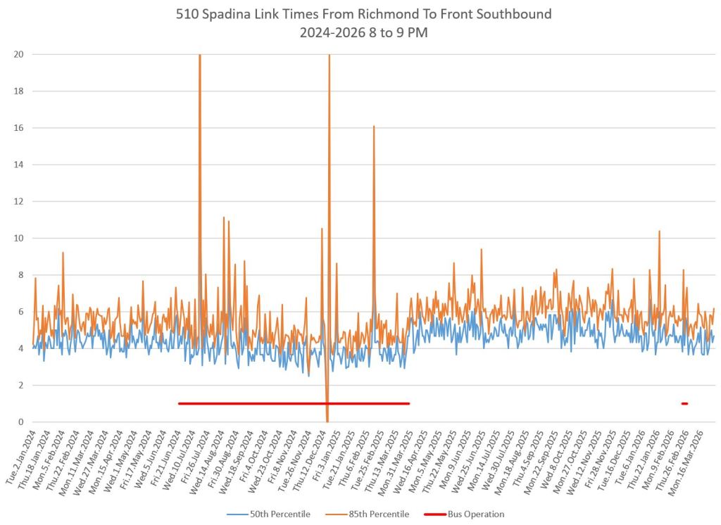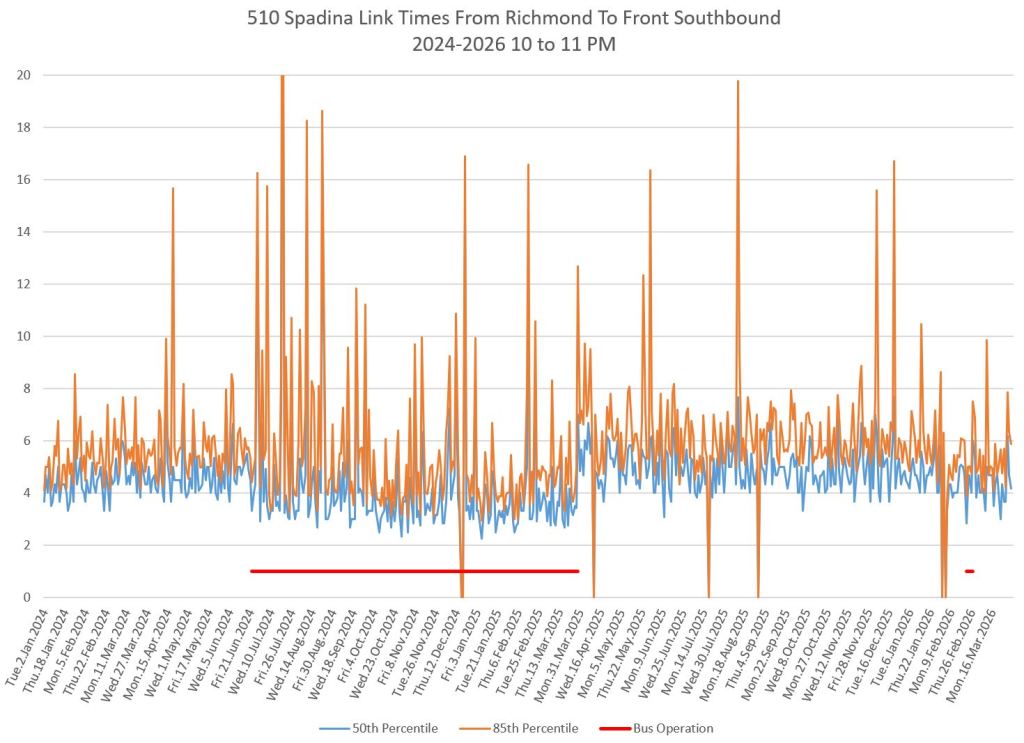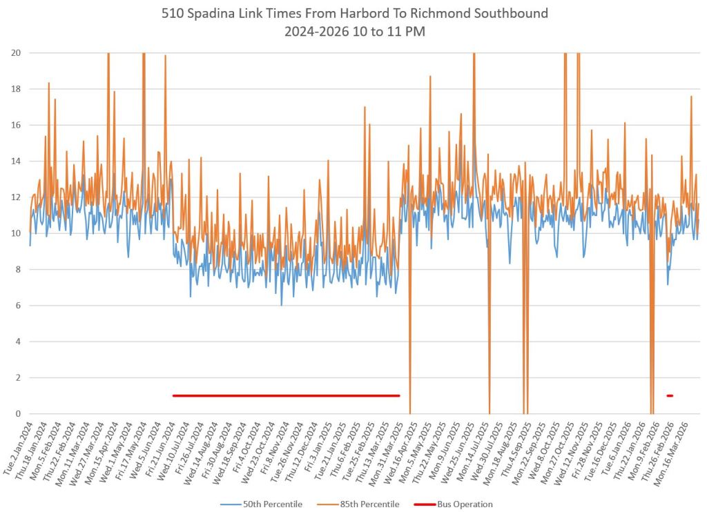For an extended period in 2024-25, the 510 route operated with buses and was, for a time, diverted to St. George Station. Comparisons between streetcar and bus travel times varied through this period depending on the location, time of day, traffic conditions and the degree of priority given to buses, if any.