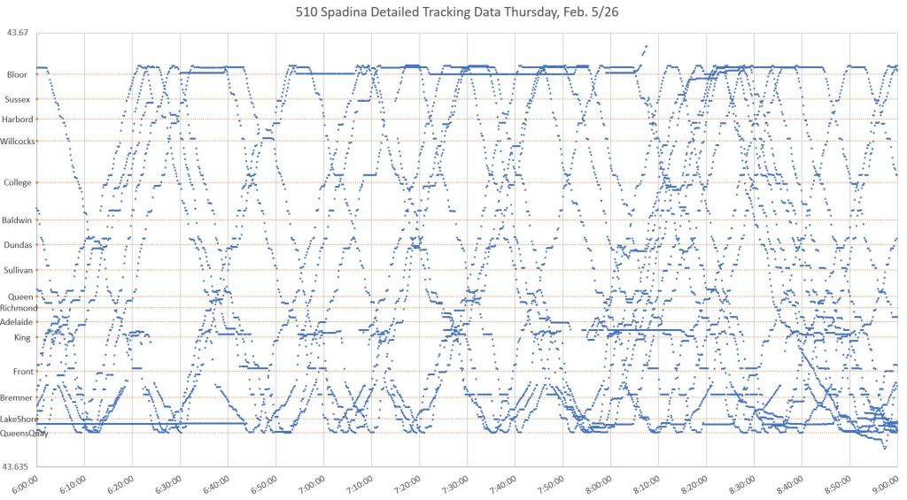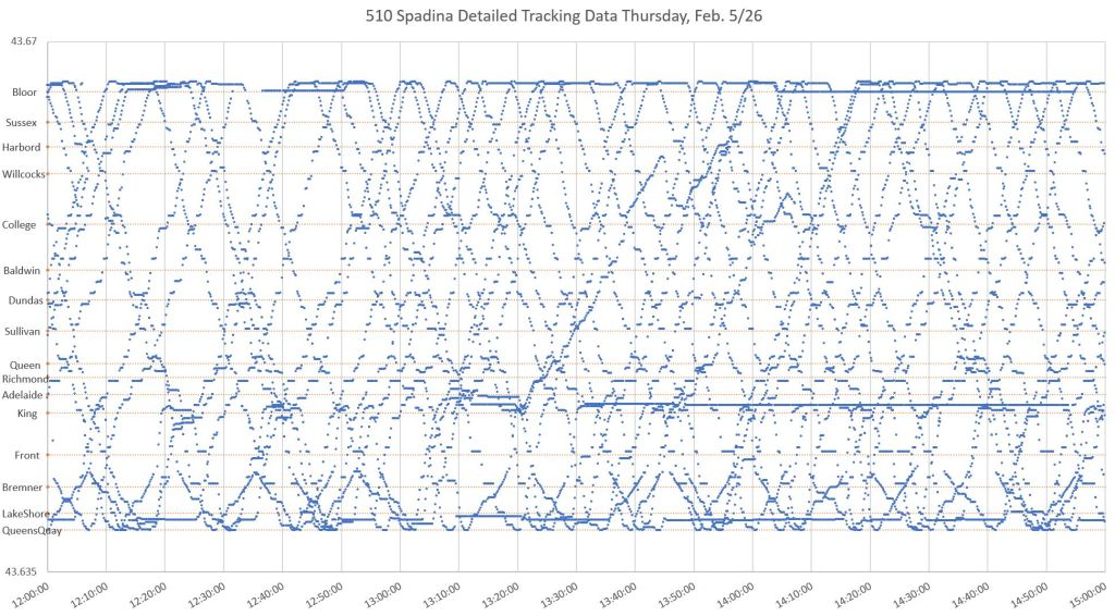 The charts below show all of the data points for February 5, 2026, plotted with latitude on the Y-axis and time on the X-axis. The result is similar to the charts published here in many previous articles, and this plot “works” because the segment of the line included is straight. Latitude can be used as an indication of vehicle position along the route between Queens Quay and Bloor.