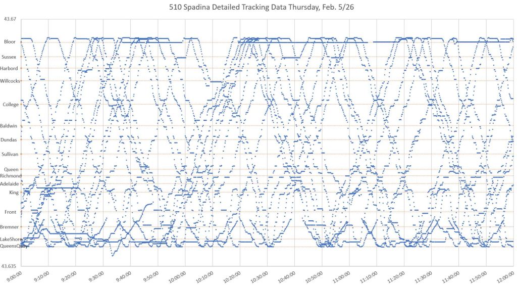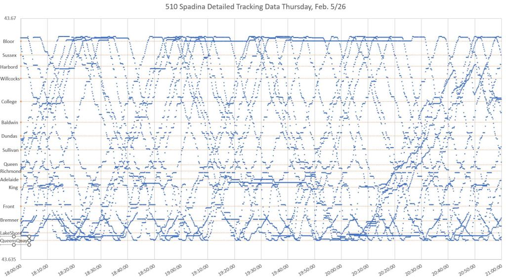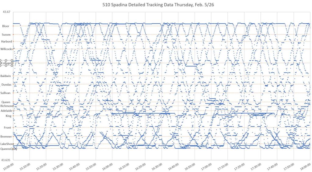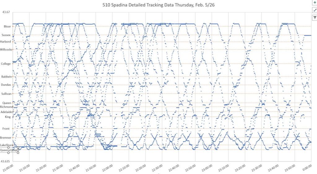 Where a car is stationary long enough, there is a horizontal line of dots. This shows clearly where cars encountered delays. Longer delays and layovers are obvious at Spadina Station (at the top) and on the approach to the station where cars often queue. Other locations include just north of King (cars laying over on Charlotte Street after short-turning at Adelaide), at Bremner and south of Lake Shore (Queens Quay Loop).