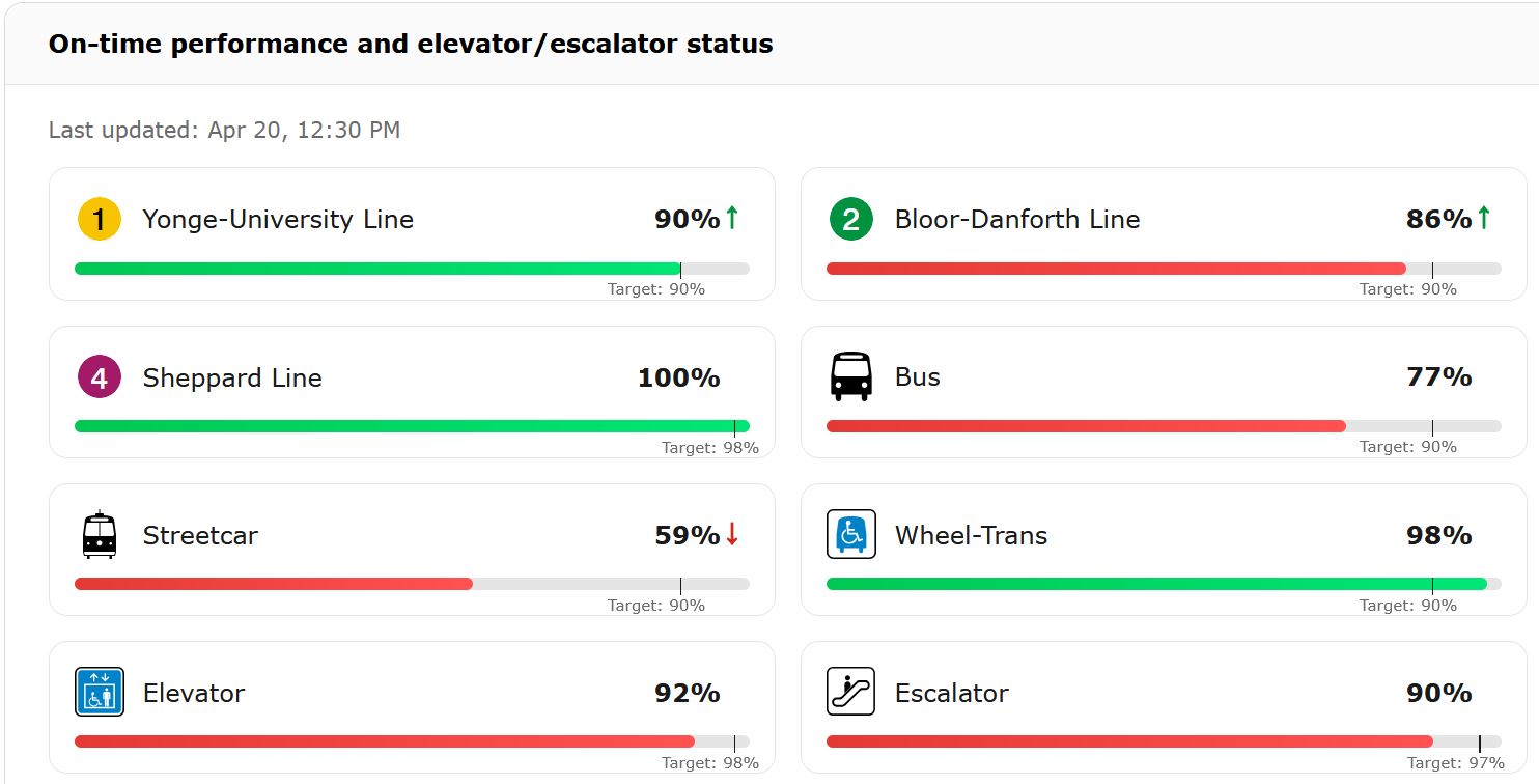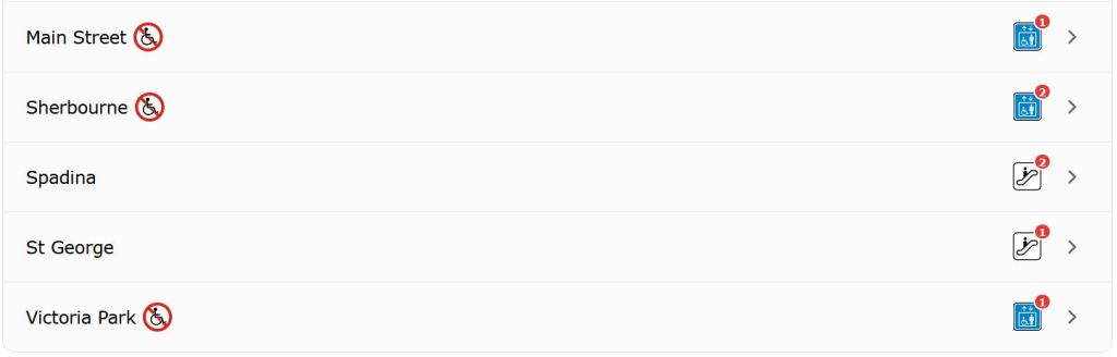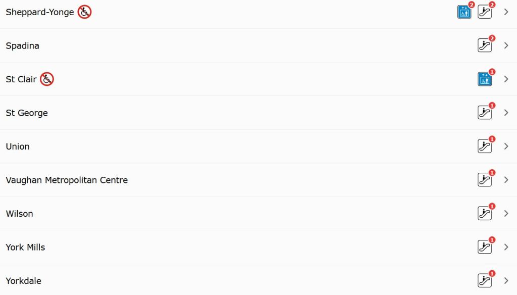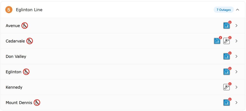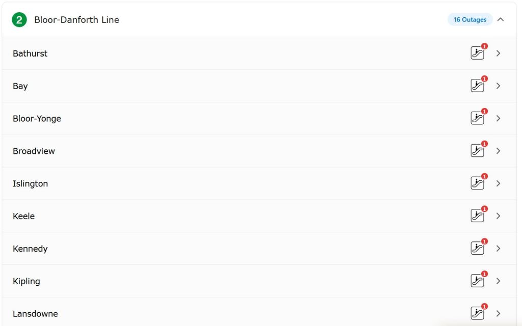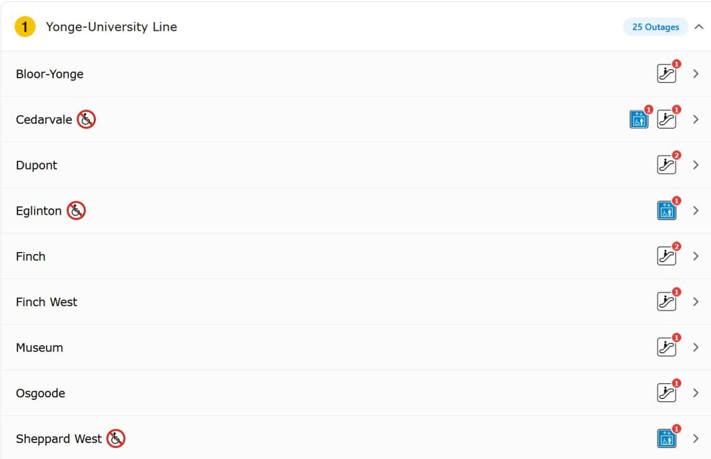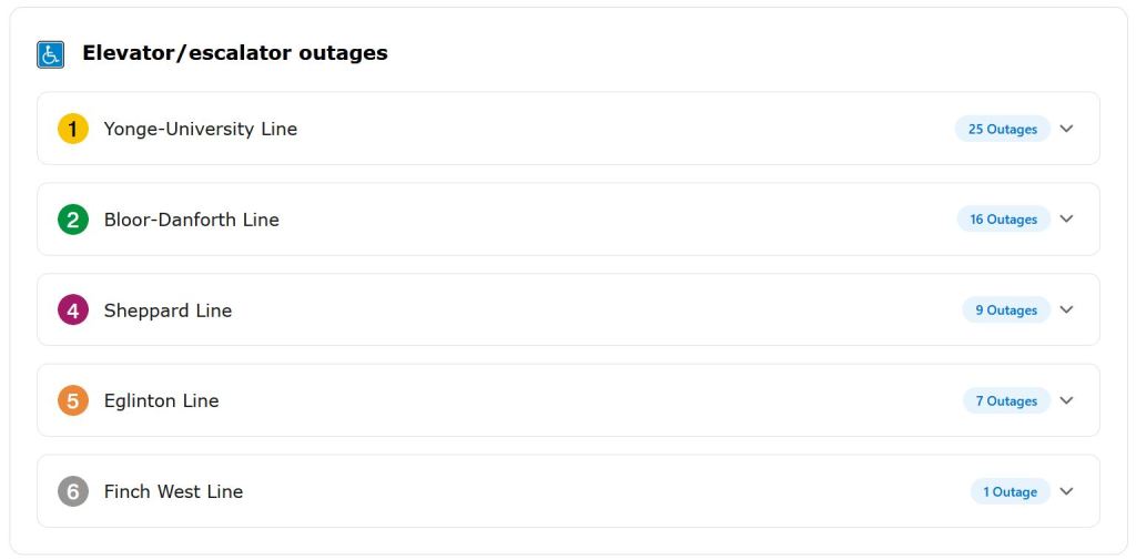 This situation prompted me to look at the TTC’s website where the landing page includes information about elevator and escalator outages. Here is the overview of status by line: