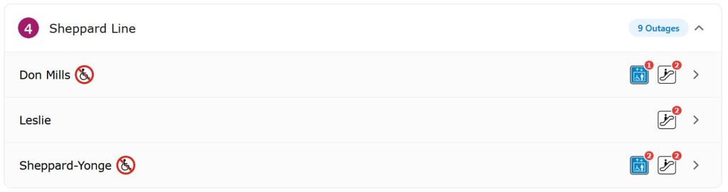 Lines 4, 5 and 6 stats are below. Note that Metrolinx through their P3 partners, Mosaic and Crosslinx, are responsible for Lines 5 and 6 respectively. The two out-of-service elevators at Sheppard-Yonge are in private buildings and are not maintained by the TTC.