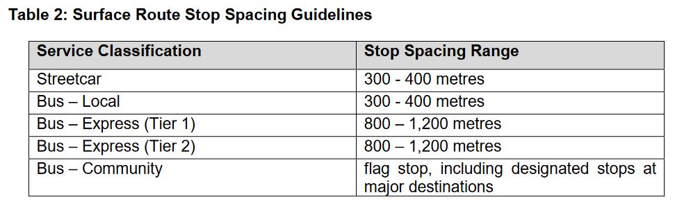 Streetcar route averages lie roughly in the 250m-325m range below the standard’s midpoint of 350m. Some stop trimming has already occurred to eliminate very closely spaced stops.