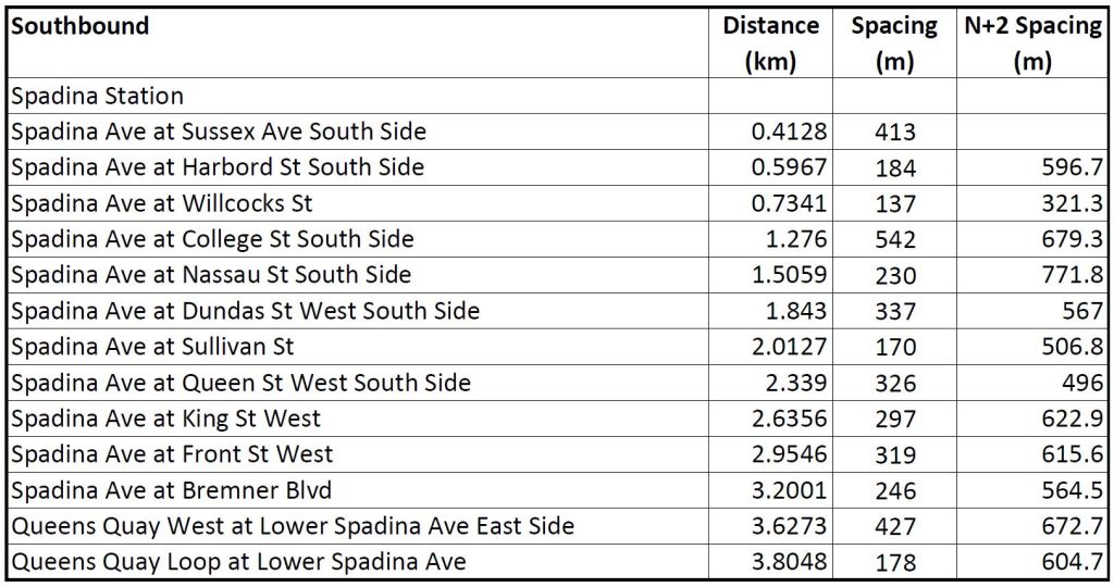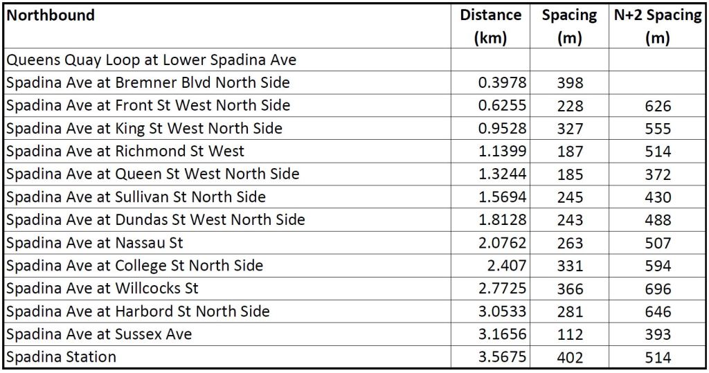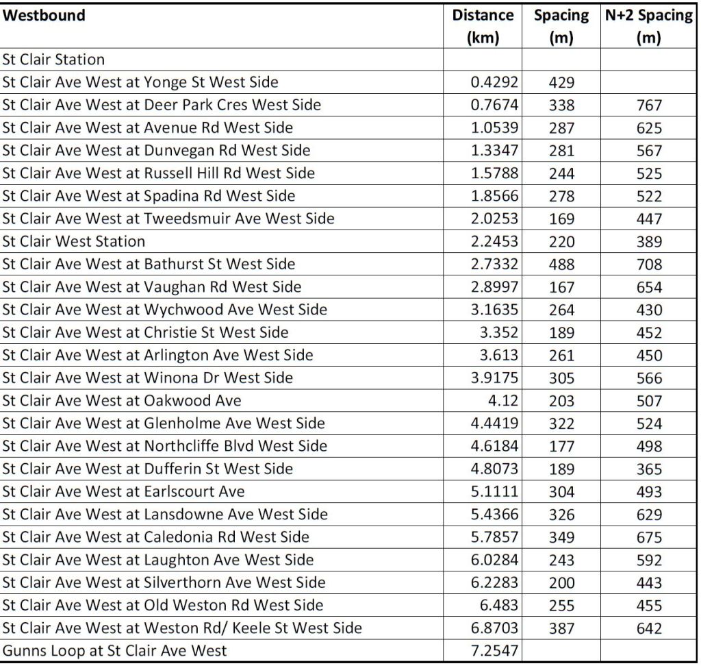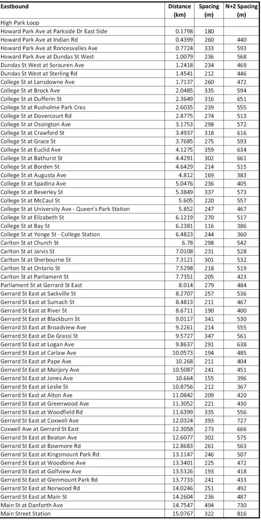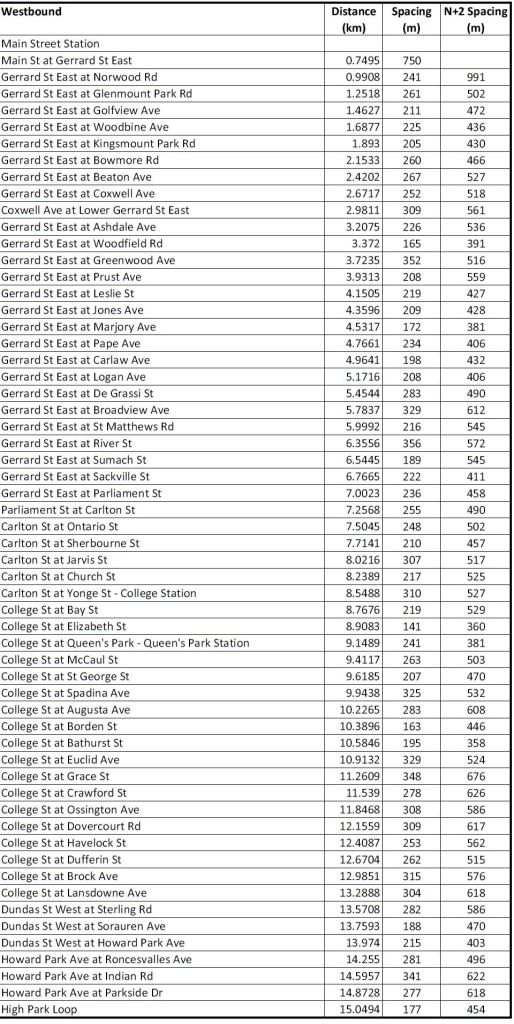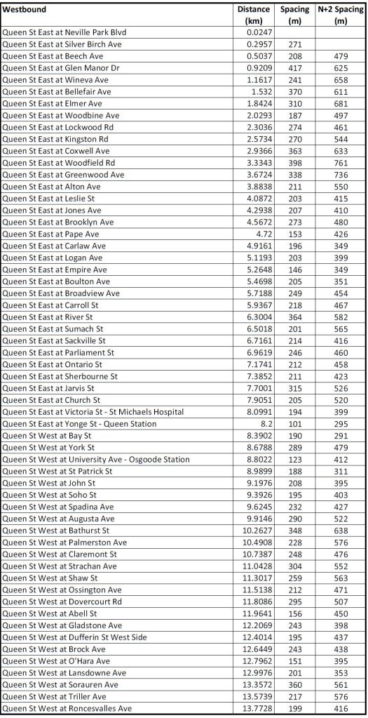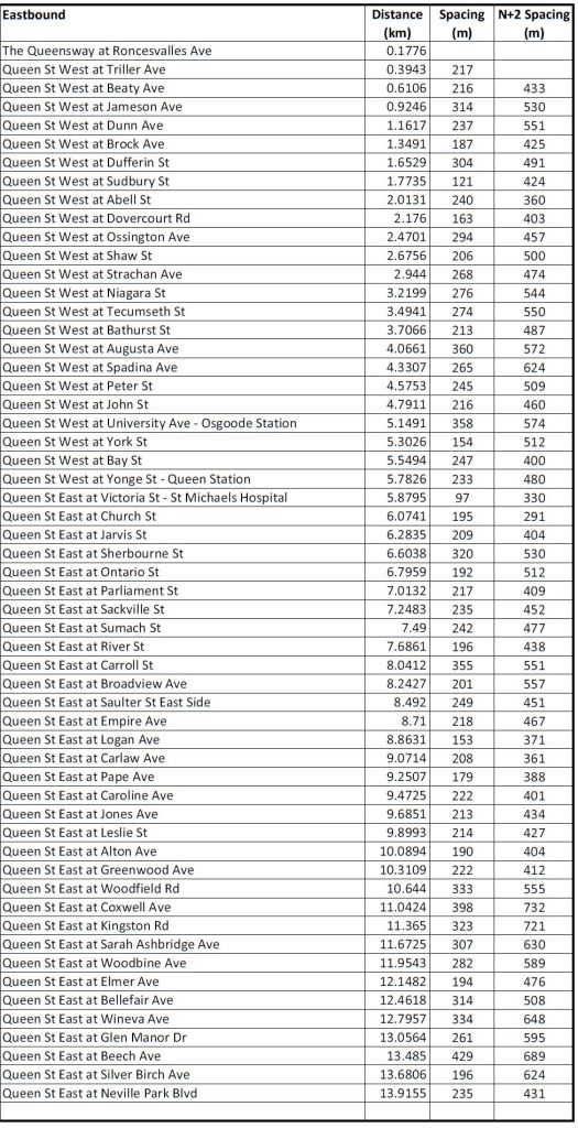 These tables of stop spacing on Queen cover the route from Roncesvalles to Neville. West of Roncesvalles on The Queensway, stops are already further apart, and given the physical infrastructure would be extremely difficult to move. The major problem on that section of the route is the absence of transit priority at signals, farside stops with the “double stop” pattern seen on other routes, and operational restrictions on speed crossing intersections.