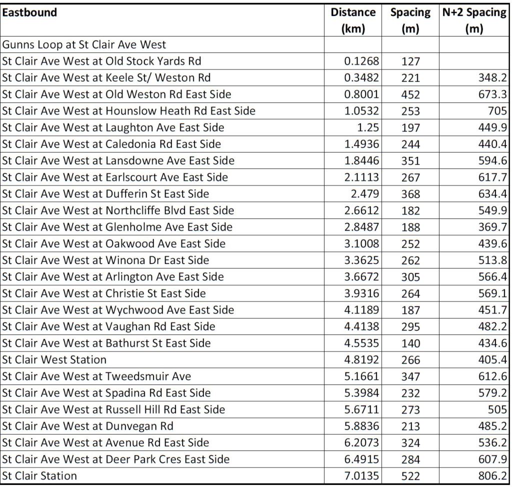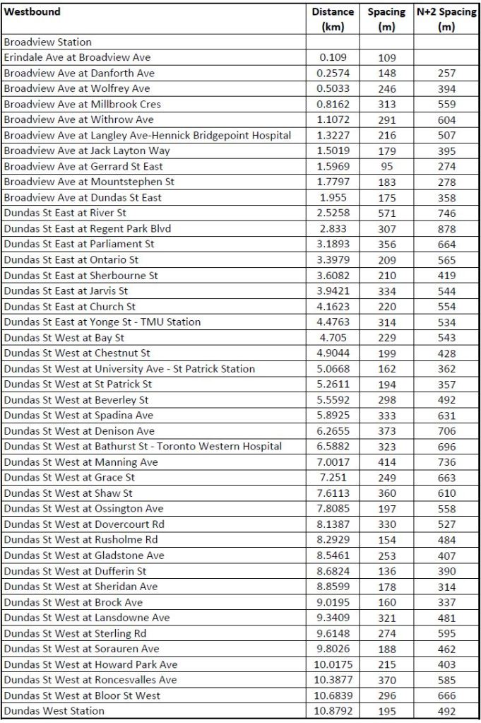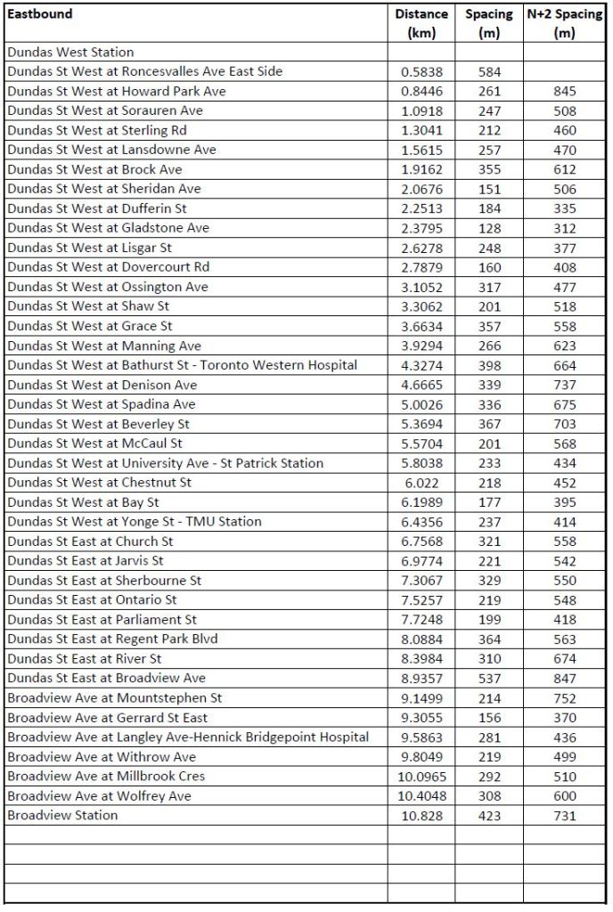 The tables below show the eastbound and westbound stop lists for 505 Dundas together with the elapsed distance along the route, the space between adjacent stops, and the “N+2” spacing showing the gap that would be created by removing each stop. First cut candidates for removal are those locations where the N+2 value remains within the 300-400m standard, although these are subject to local considerations such as the density of traffic generators and connections to other routes.