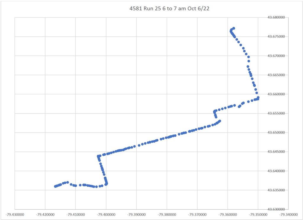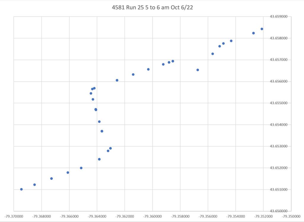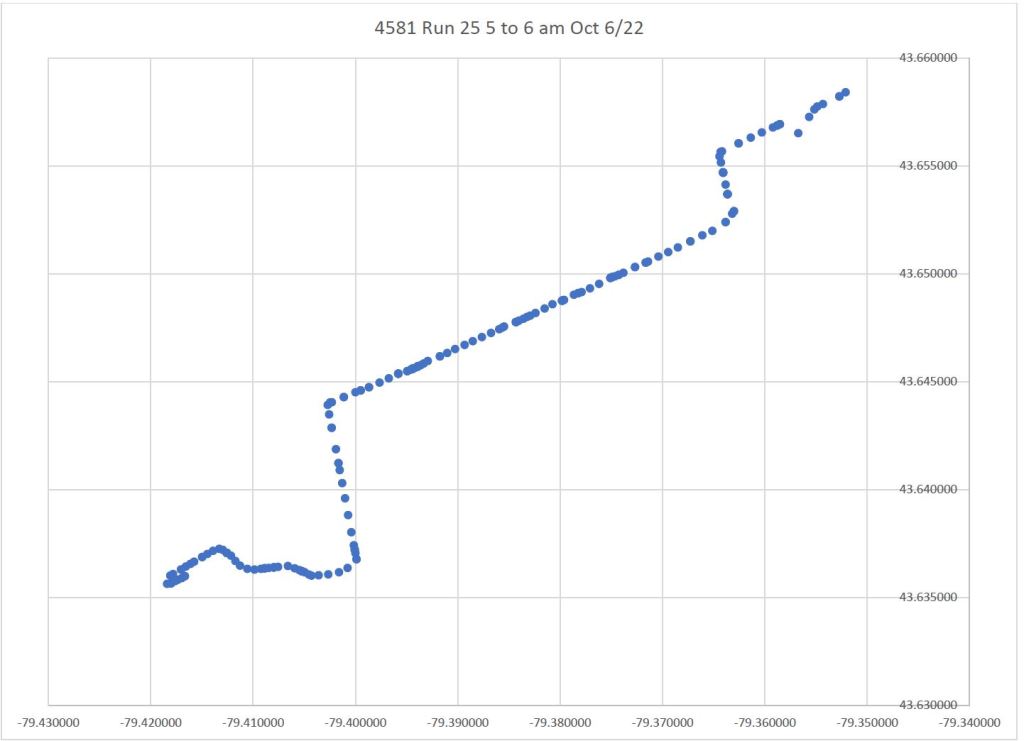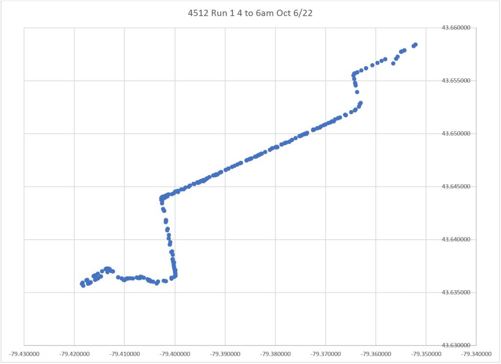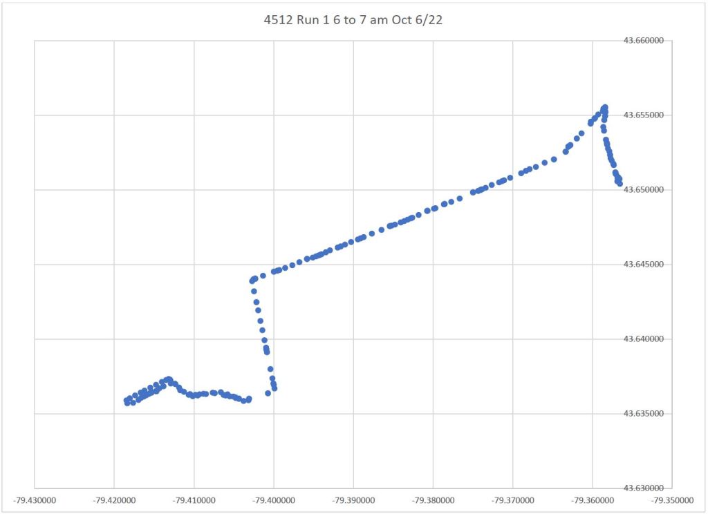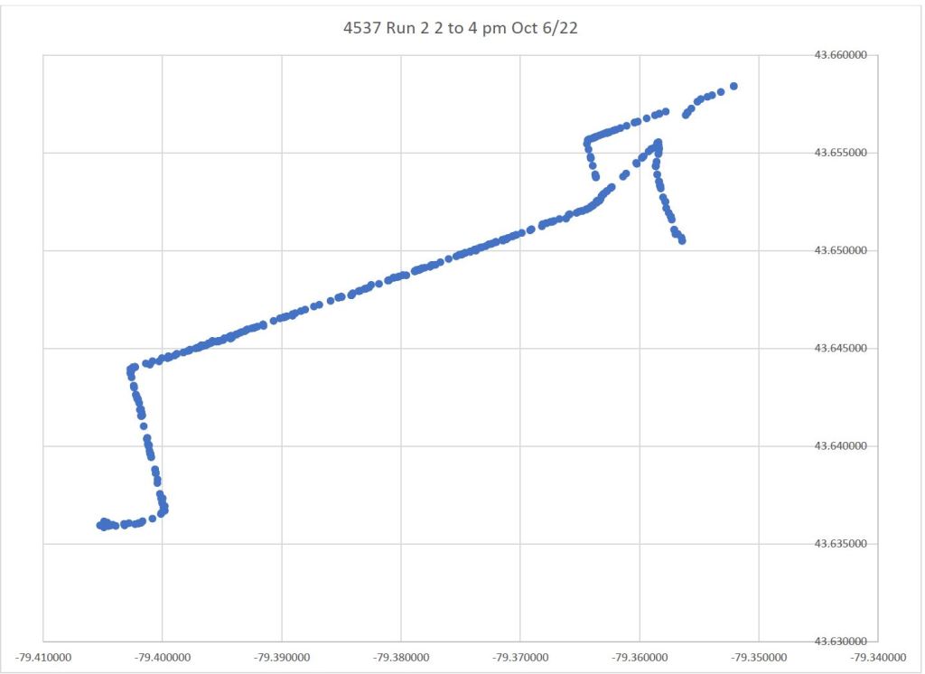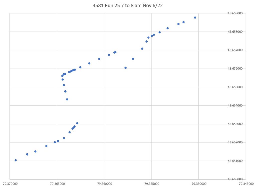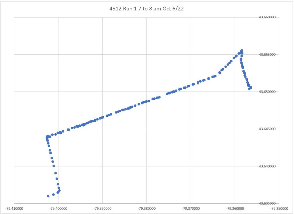 On the return trip to Broadview Station, data points are plotted on King for a short distance east of Parliament, as well as on King west of River, although the car clearly travels via Queen & Parliament.