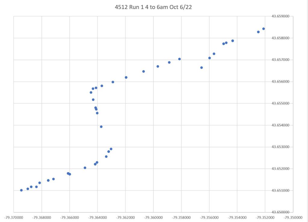 The first pair of images show the early period for Run 1. It is a 504A Distillery car, but it enters service from Leslie Barns. The divergence of data points from Queen Street at River Street is quite evident here. These points are sequential in the GPS logs.