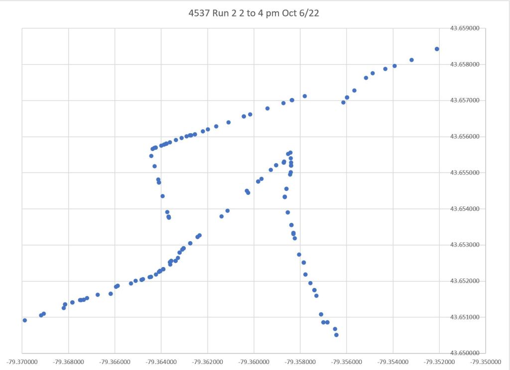 This is Run 2 which enters service n the early afternoon. It too is a 504A car. These images show data from 2 to 4 pm, and this includes the trip into service plus the return trip to the Distillery. The same diversion of data points westbound at River is seen here, but the eastbound data along King at Parliament are ok.