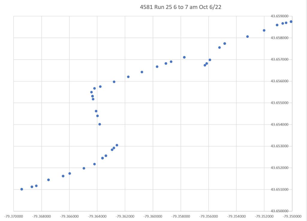 Here is Run 25, a 504B car. It enters service via Queen and Parliament, and the data at River are shifted off of Queen in the same pattern as above.
