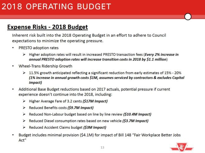 The TTC Board decided that it would include the money sitting in the Transit Stabilization Reserve as 2018 revenue, just as they did in 2017 (although in fact this was not needed because of better-than-budget results). This keeps the year-to-year subsidy increase down to $24 million paying mainly for the new cost of the TYSSE and for transitional increases in fare handling while Presto and the legacy fares both remain in place. Using that reserve is an example of a “bridging strategy” because the reserve will not be available in 2019 if it is depleted in 2018, and new revenue will be needed to replace it. That $24 million pressure from the TTC (with more to come from unfunded proposals) crowds other City departments and agencies by taking the lion’s share of new spending.