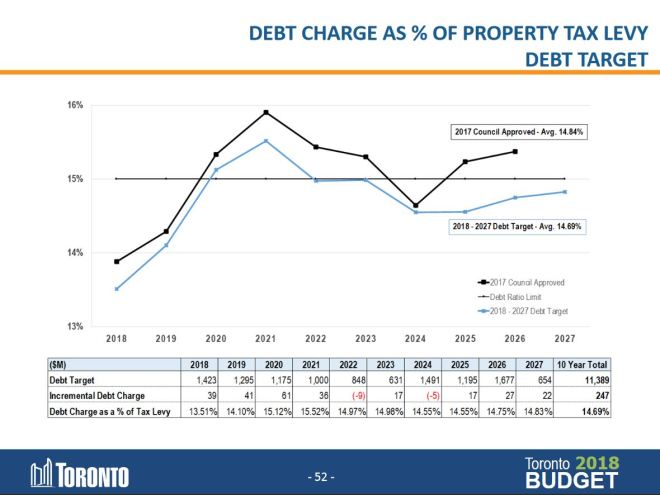 The City of Toronto has a policy that total debt service payments should not exceed 15% of property taxes. This was changed in recent years from a hard cap to one that considered the 10-year average debt ratio mainly to deal with a bulge in borrowing that will peak in 2021. That bulge would affect projections well into the next decade as lower-than-average borrowing in 2018-19 slips off of the chart but must be replaced by comparably low numbers in 2028 and beyond to hold down the average while the 2021 peak is “digested”.
