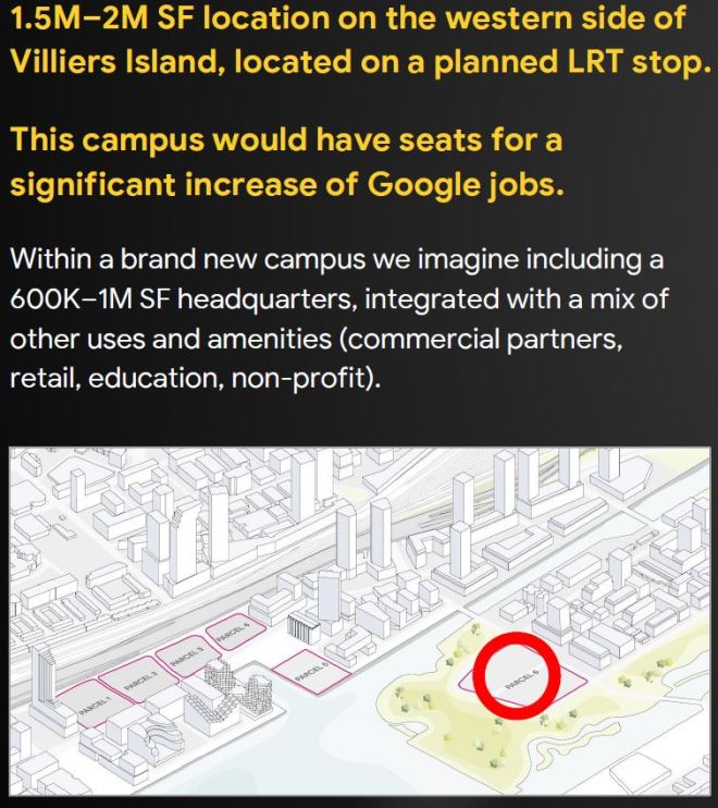 Brand new in the Sidewalk proposal is a new Google Canada headquarters located on the west side of New Cherry Street, a prime spot within “Villiers Island”, a new island that will be created as part of the Don Mouth project. [From p. 10 in the updated Sidewalk presentation deck]