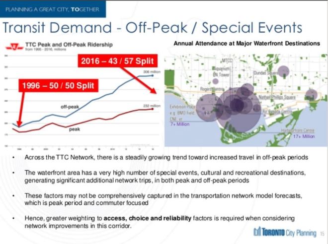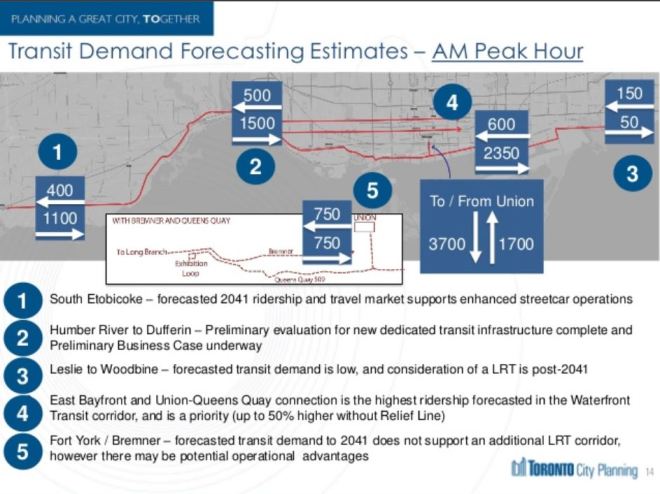 Now Mayor John Tory has shifted his position on ST’s benefits somewhat, but keeping his personal project alive diverts attention and funding. A Waterfront Reset study now underway by City Planning, Waterfront Toronto and the TTC owes more to the demand for better transit to the Humber Bay Shores than to the new developments in the eastern waterfront. Political dynamics on City Council are such that the western extension could be first out of the gate leaving the eastern waterfront high and dry, so to speak, for better transit. Design for an extension of the existing streetcar track at Exhibition Loop west to Dufferin with provision to go further is already underway. [See the Exhibition Place Streetcar Link tab within the Waterfront Reset page.]