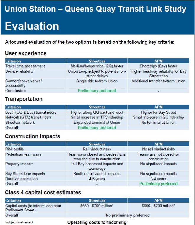 A third route into Union, the Bremner LRT, did not appear in the City proposals. It would, in any event, be impossible in the People Mover configuration. This proposal never made sense as Bremner is not wide enough to host an LRT route separate from Queens Quay West. A third service competing for platform space and track time at Union would make that interchange even more challenging than with only the west and east LRT services. City Planning could do everyone a favour by formally removing the Bremner route from their maps. This would also end a rather contentious debate about how a this route would affect the area west of Bathurst and south of Fort York.