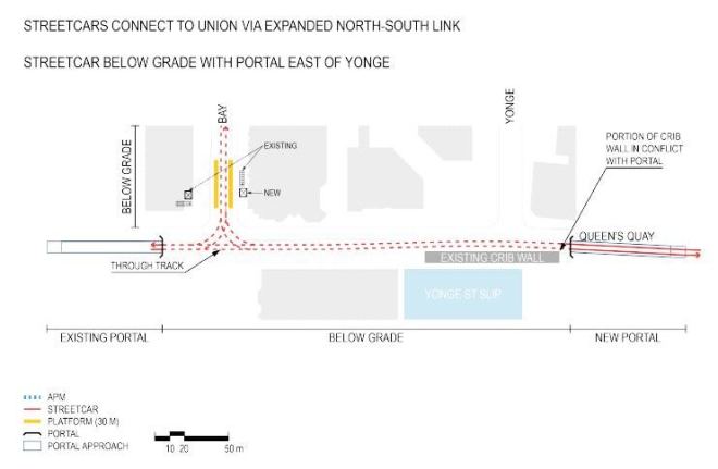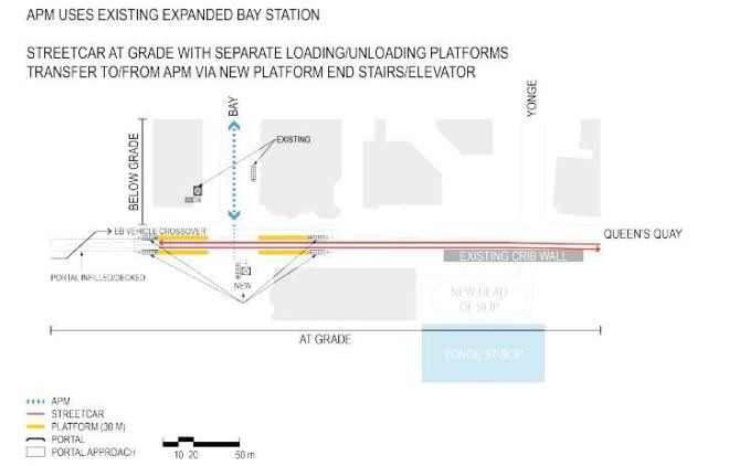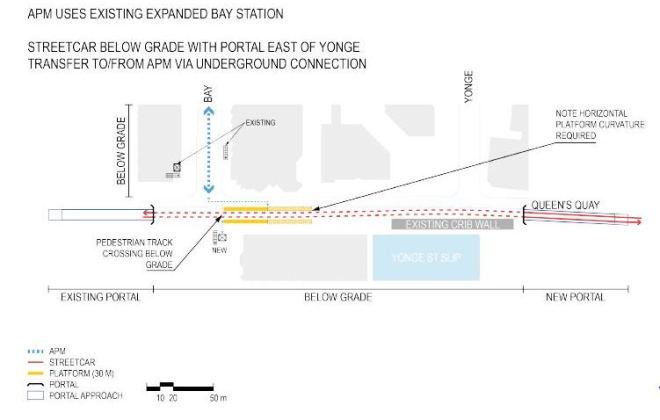 It is ironic that the impetus for removing streetcars from Bay Street came from the hope that the existing portal between Bay and York streets could be filled in, and that a new portal east of Yonge would not be required. However, the People Mover option, with its underground station, does not achieve this goal.