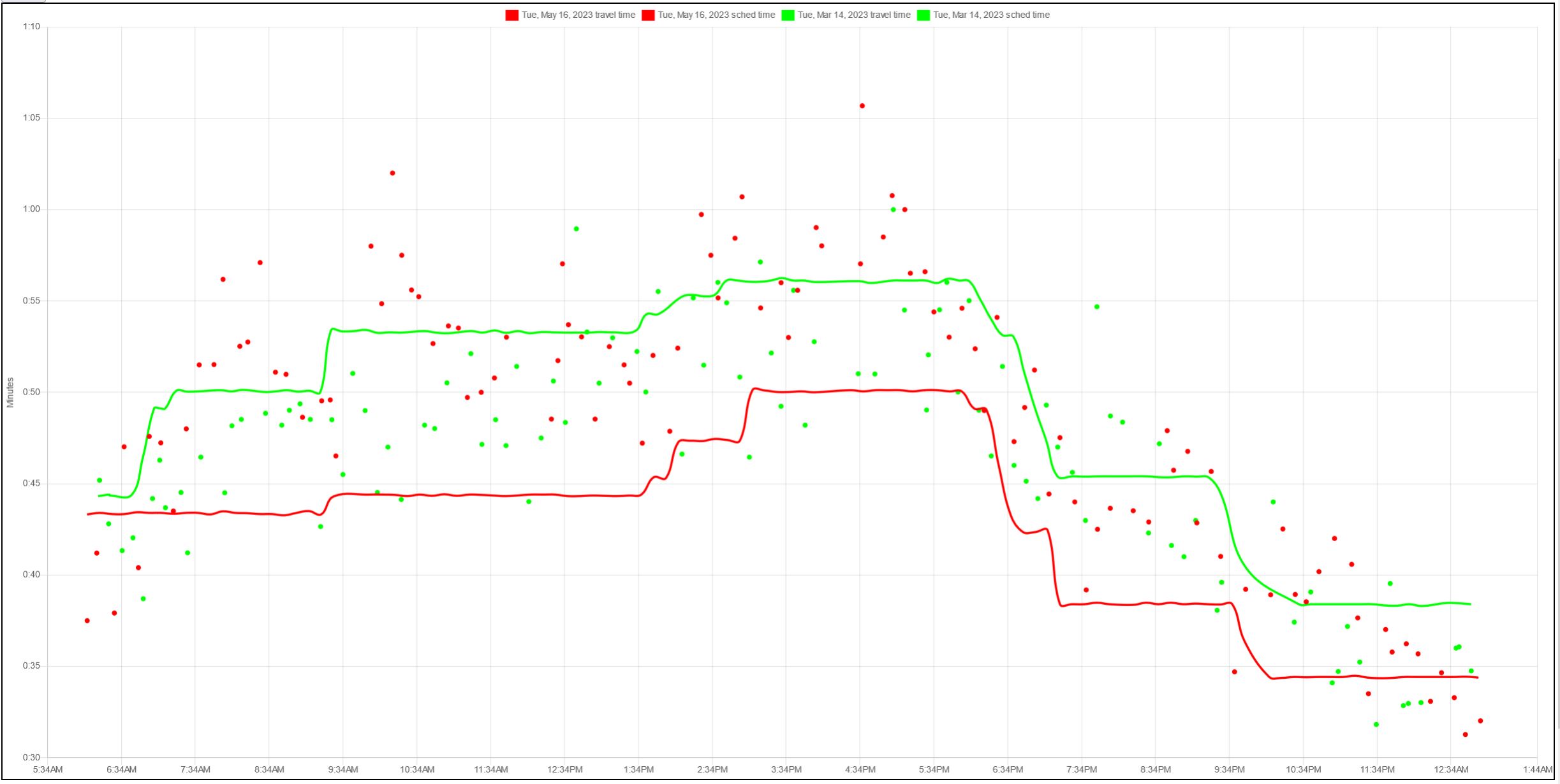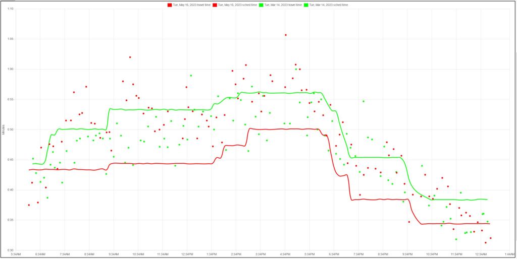 This article begins with a comparison of scheduled travel speed on each route, and then turns to actual travel speeds by route segment. In the interest of length, I will leave a discussion of headway reliability to future articles. This is an important component of total travel time, especially for short trips or trip segments.