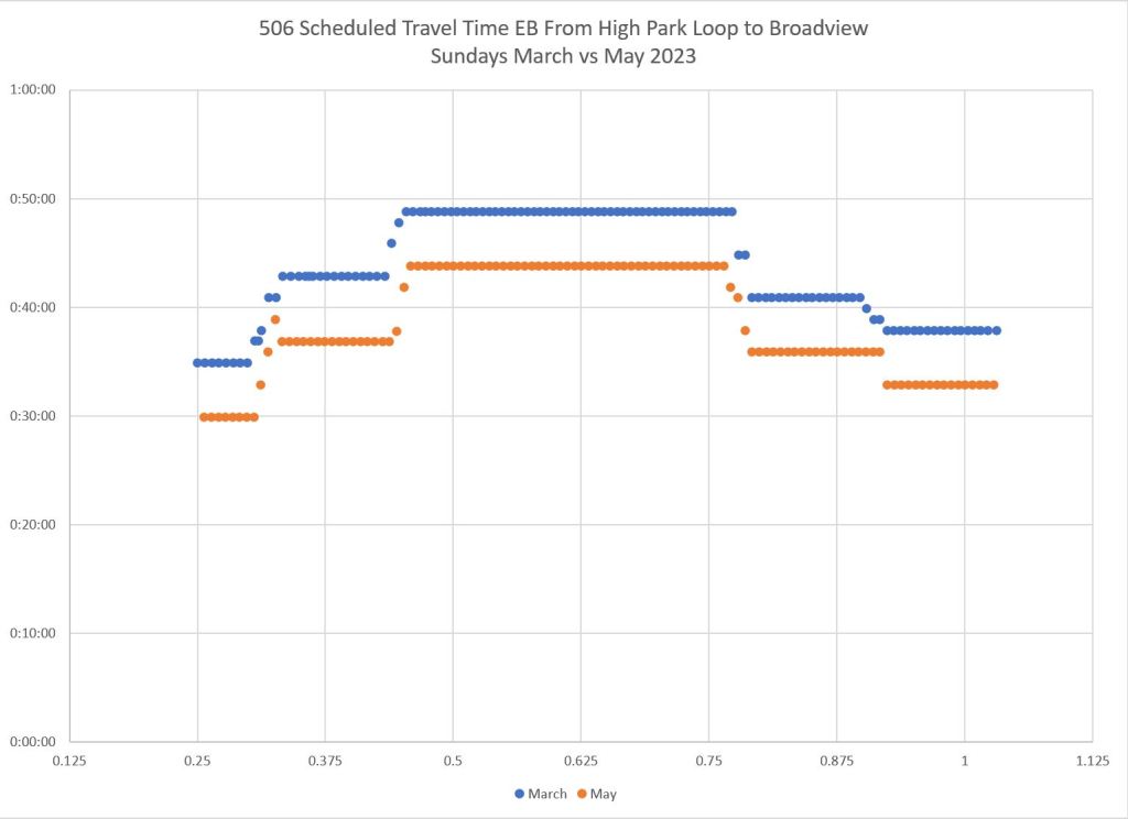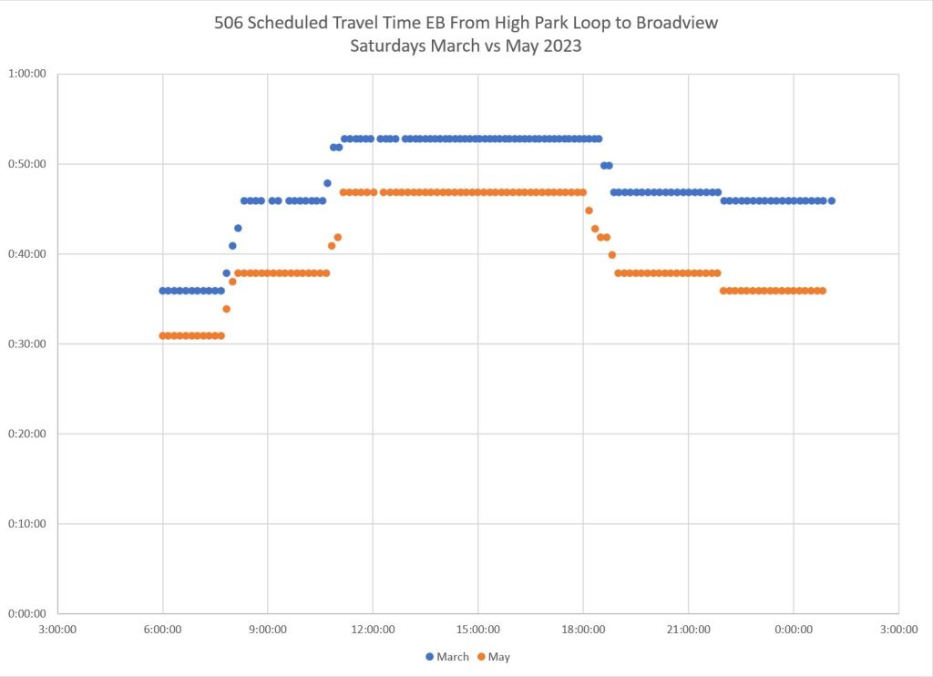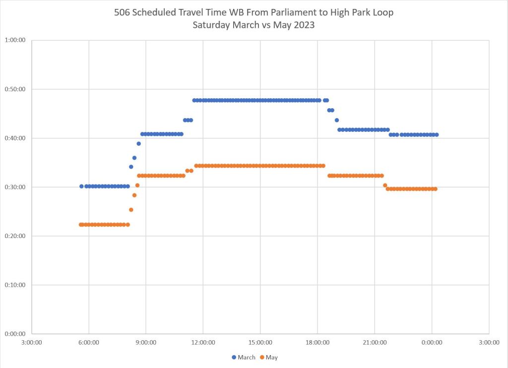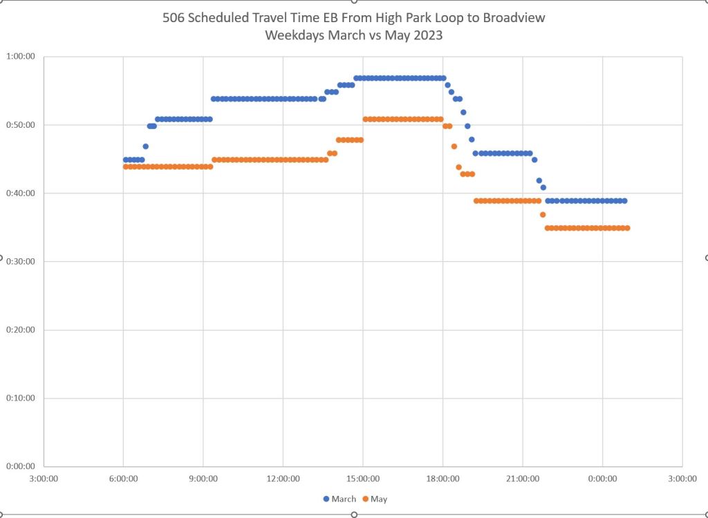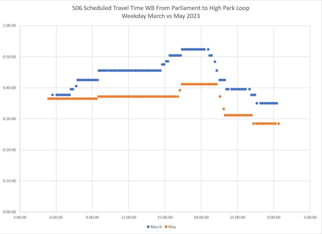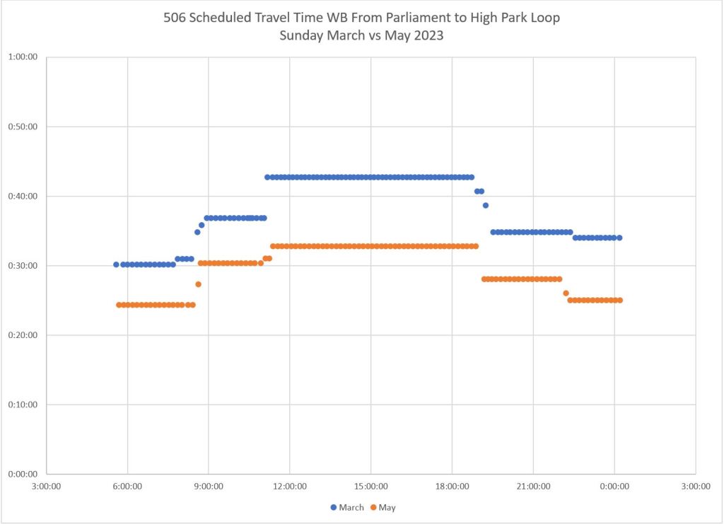 An important message in all of this is that “congestion” (put in quotes because it is so often cited as a get-out-of-jail-free excuse for all transit woes) varies from place to place and time to time. Simply putting transit priority everywhere will not solve all problems and could even be overkill (even assuming that it is true “priority” and not a sham to keep transit vehicles out of motorists’ way). It is simple to colour a bunch of key routes end-to-end on a map, but much harder to identify changes that will actually make a difference. Meanwhile, a focus on “priority” could divert attention from badly-needed improvements in headway reliability and more reliable wait times.