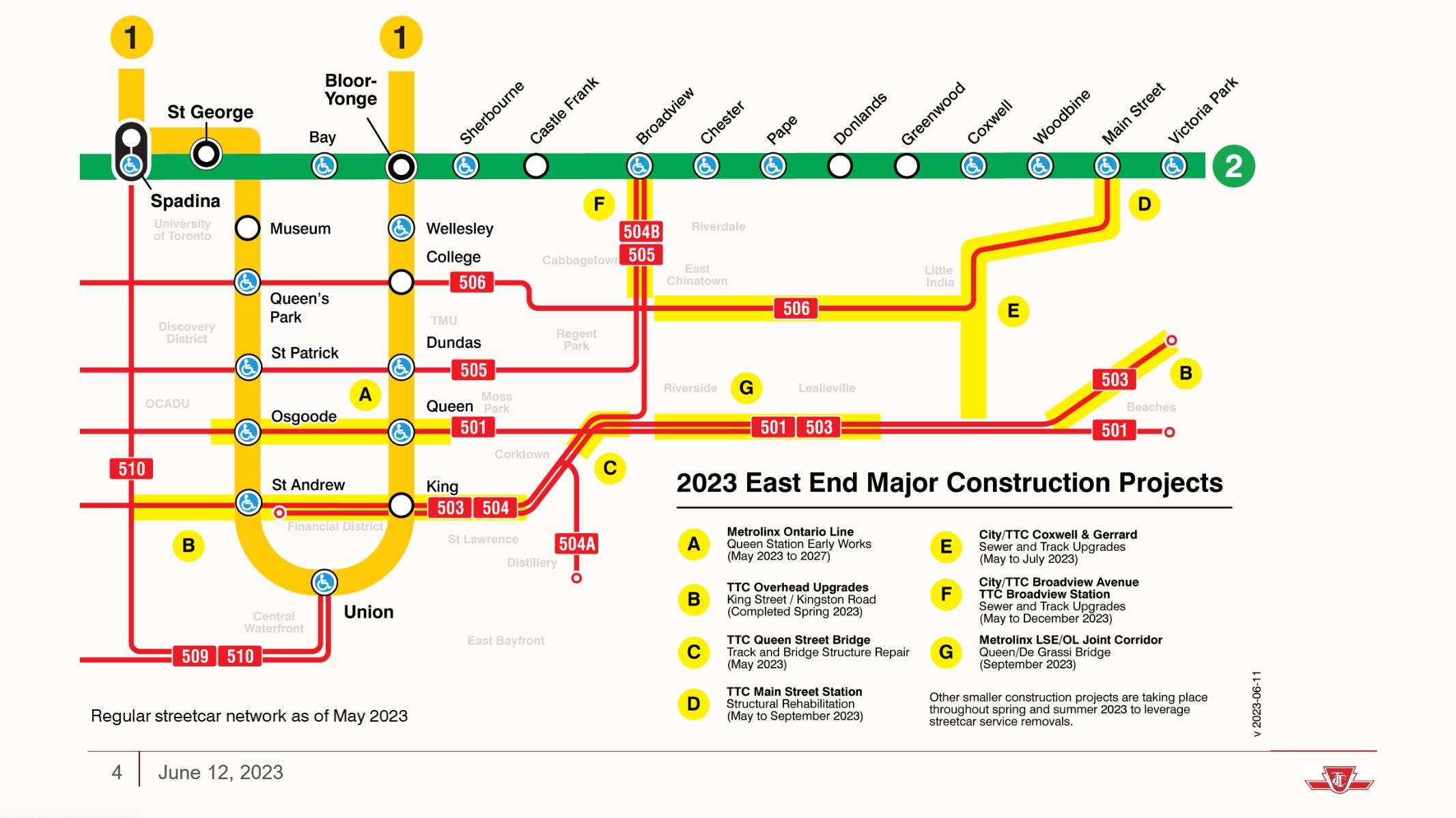 I have also included tables showing the constant change in route configurations on the four major east-west corridors thanks to a never-ending procession of track and water main work, rapid transit construction, and overhead changes for pantograph operation. Some of this work was accelerated to take advantage of lighter traffic conditions during the pandemic, and some to bring forward work to keep staff employed.