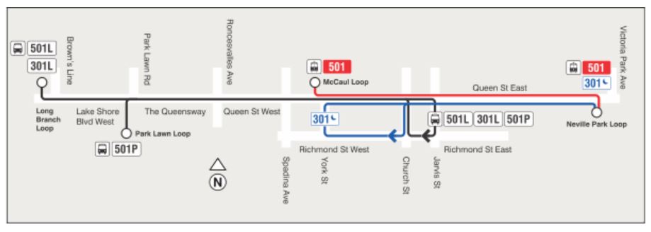 - There is no change to the existing 501 Queen streetcar service between Neville Loop and Bathurst Street (Wolseley Loop), nor to the 301 Blue Night Bus operation.