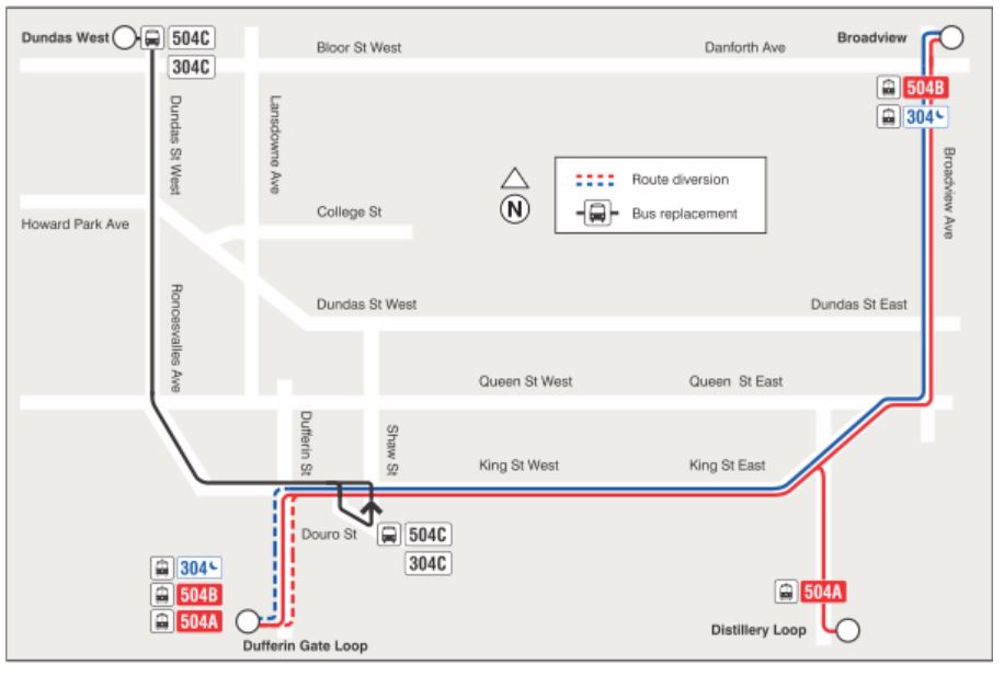 - The 501H/501L Queen replacement buses for service on the west end of the route will be shortened to turn back downtown via University Avenue, Adelaide Street and York Street rather than operating to Broadview & Gerrard or Broadview Station.