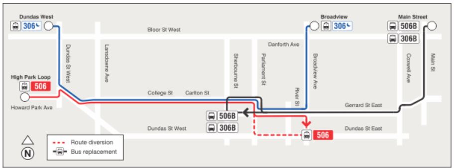 - 306 Carlton Blue Night will operate with buses to Dundas West Station.