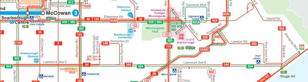 With all the focus on the shared route between Scarborough Town Centre and Kennedy Station, there remains the much longer portion of routes that have been extended. While the red lanes, and later the BRT roadway, should minimize further sources of irregularity, this does not change the fact that some of these routes have service issues east and north of STC.