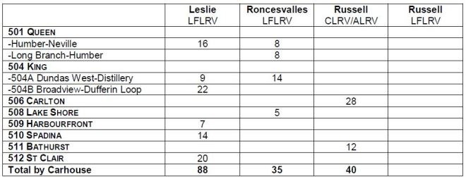 - Russell: 501/301 Queen, 503 Kingston Rd., 504 King, 511 Bathurst, 512 St. Clair