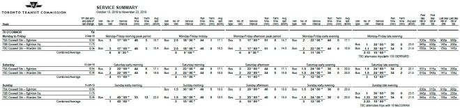 To put this in context, here is the section from the TTC’s Scheduled Service Summary which describes the service as it should be on 70 O’Connor. (Click on the table to expand it.)