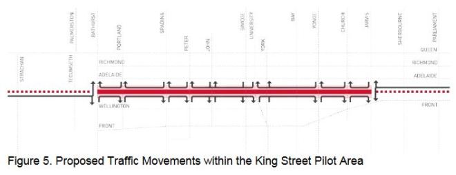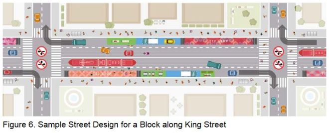 In brief, King Street between Jarvis and Bathurst Streets would be modified as below: