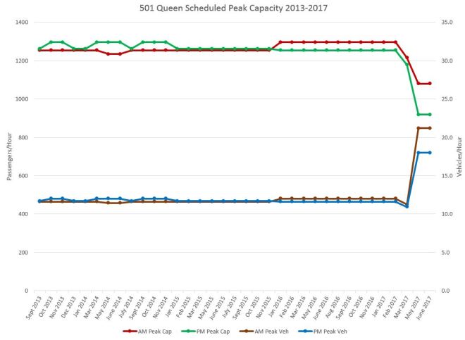 - The capacity of scheduled bus service is less than the scheduled capacity of streetcars at the beginning of 2017. Service for 501 Queen is based on the capacity of ALRVs.