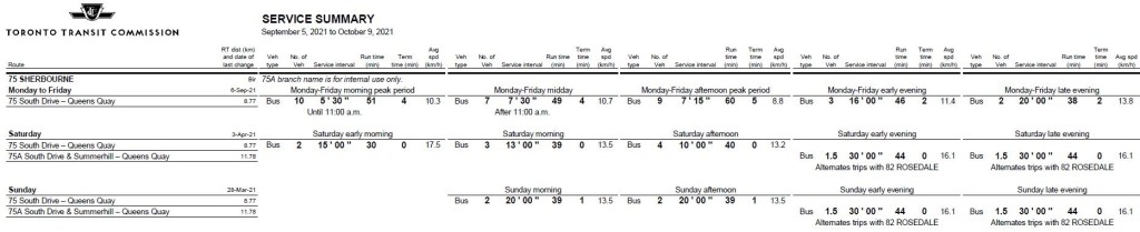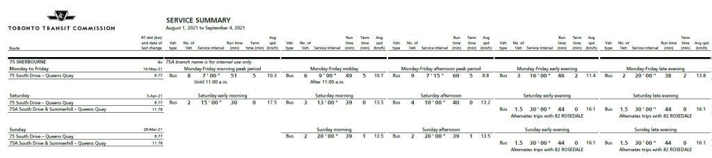 75 Sherbourne shows all of the problems seen on other routes including missing vehicles and bunching, and, in some periods, a lack of sufficient running time to provide for recovery from minor incidents enroute. Service is often unreliable.