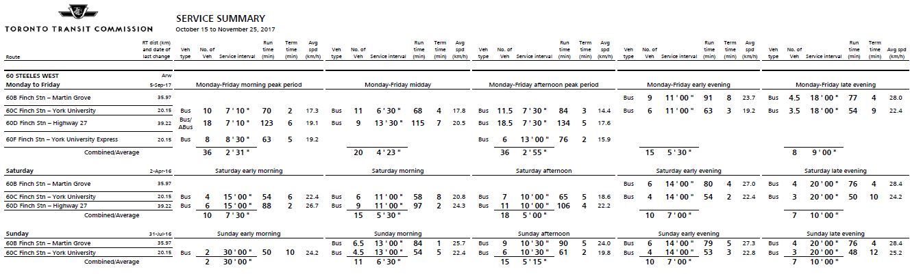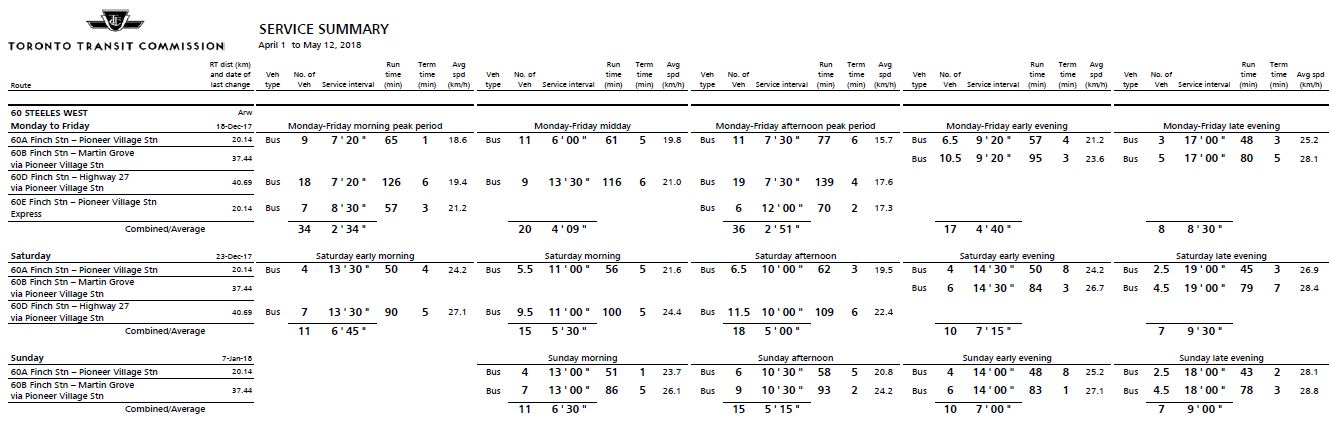 All of the data presented here were taken from the TTC’s schedules as they are published in GTFS (General Transit File Specification) format for use by travel planning apps. This almost exactly matches information on the TTC’s online schedule pages.