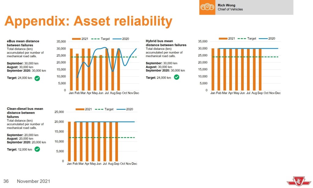 The TTC CEO’s Report includes stats on bus reliability measured as the mean distance between failures.