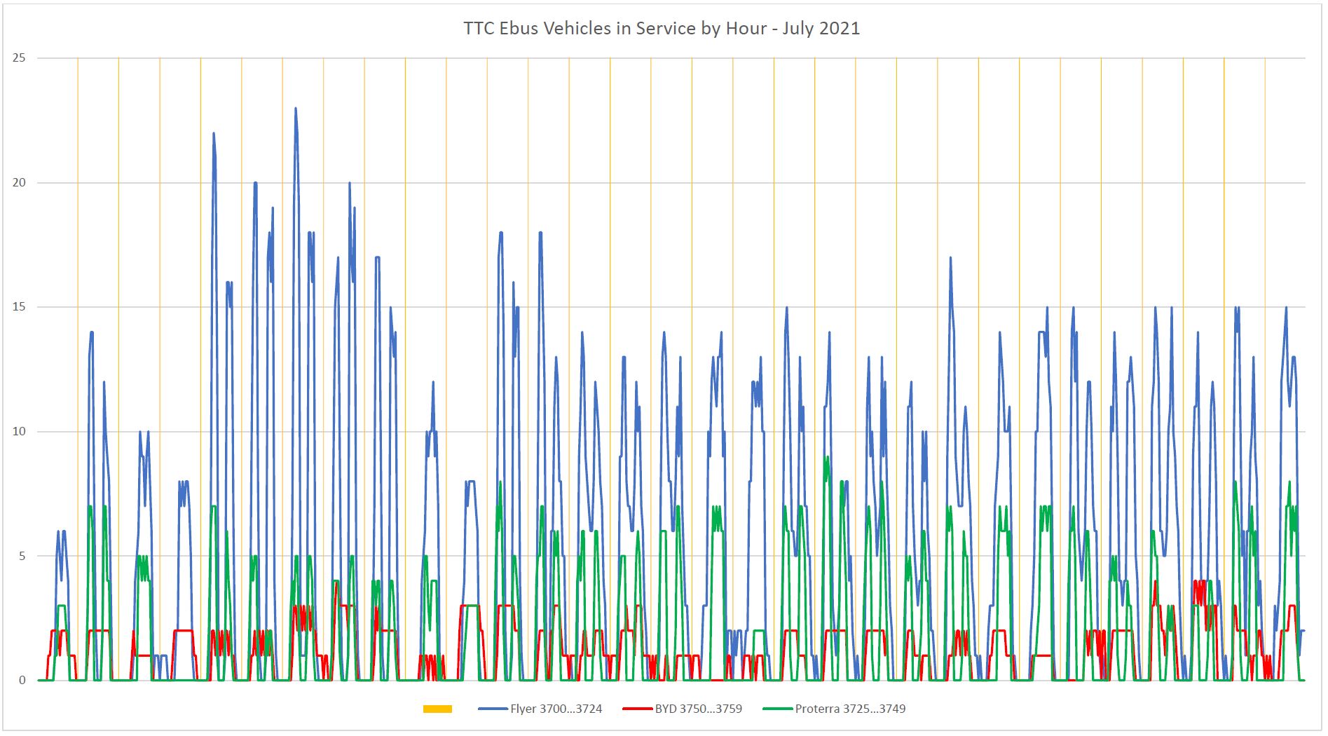 Here are the data for July 2021. Each vertical block separated by yellow lines is one day. The data for each group of buses is colour coded.