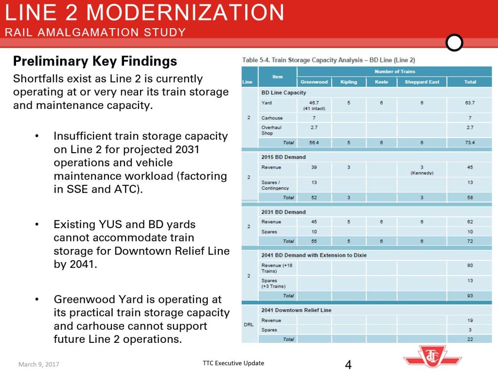 A preliminary report from the study showed that capacity would be a major problem. Note that in the context of this study, the Ontario Line did not yet exist, and the intent was that Greenwood Yard would host the Downtown Relief Line trains. Even without the DRL, Greenwood would not be able to handle expected growth in demand on Line 2.