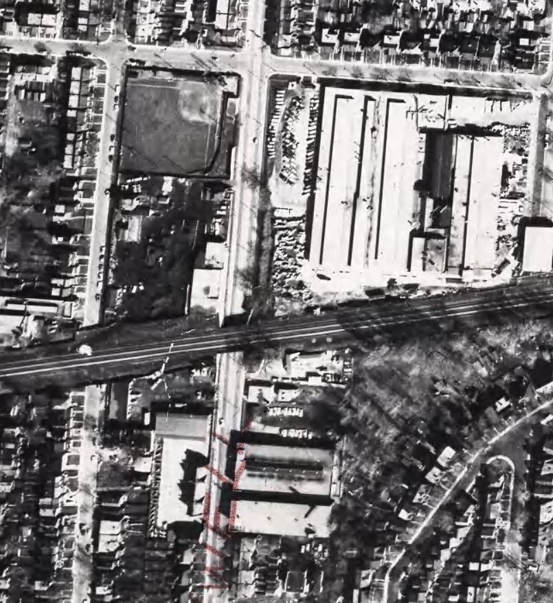 In the 1960 photo below (taken from a City archive of aerial photography), Hanson Avenue is at the top and Coxwell runs vertically through the centre.