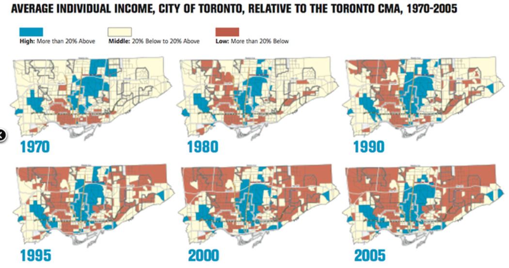 The cream-coloured areas have incomes within 20% of the average while blue and red areas are above and below this band respectively. (Note that areas with little population are also shown in cream such as northeastern Scarborough in the 1970s.)