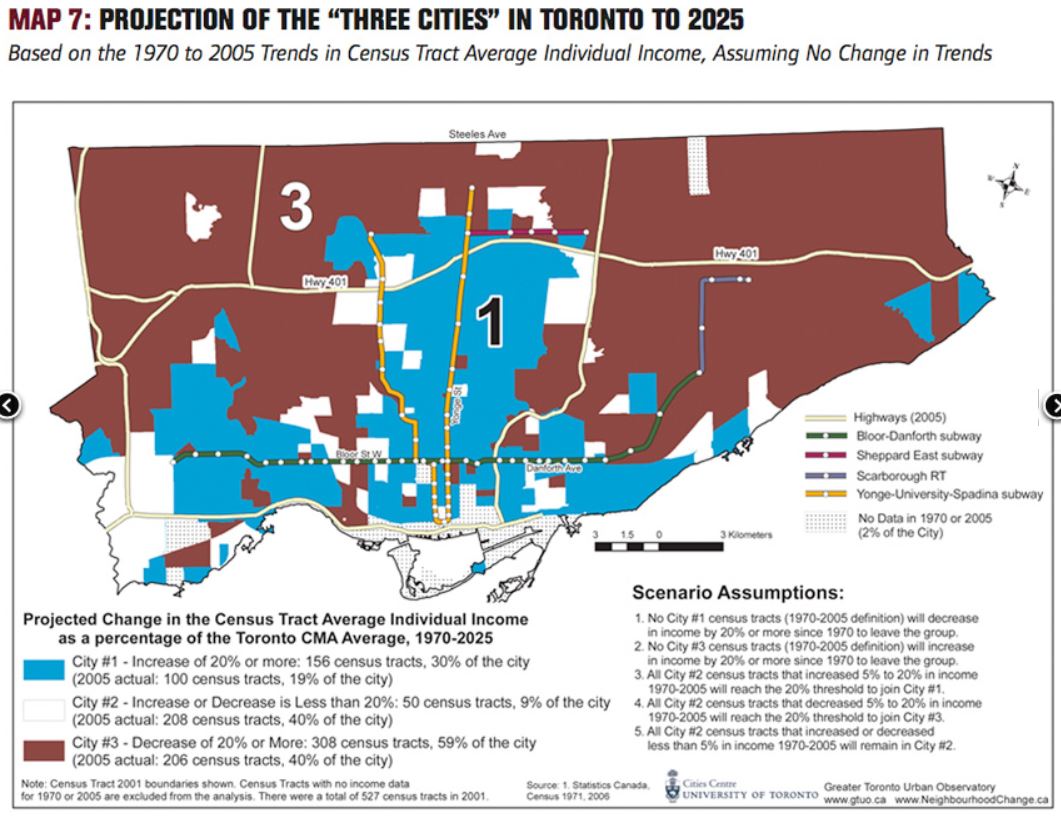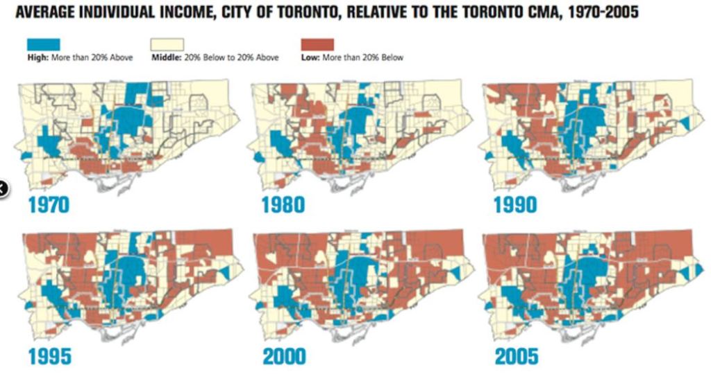 It is impossible to talk about fairness and equity in any public service without looking at the geography of incomes in Toronto. David Hulchanski at the University of Toronto published his “Three Cities” study mapping the divergence of incomes to the overall average by census tract. The map below tracks changes from 1970 to 2005.