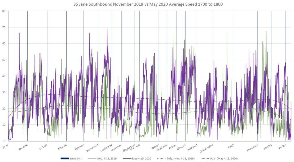 Because all vehicles are tracked by GPS with reports of their location every 20 seconds or better, it is possible to know moment-to-moment how fast they are travelling. When the values are combined, we get a profile of the operating speed along a route. The chart below compares the average speed of buses on 35 Jane by location during two periods before and after the drop in traffic level in 2020.