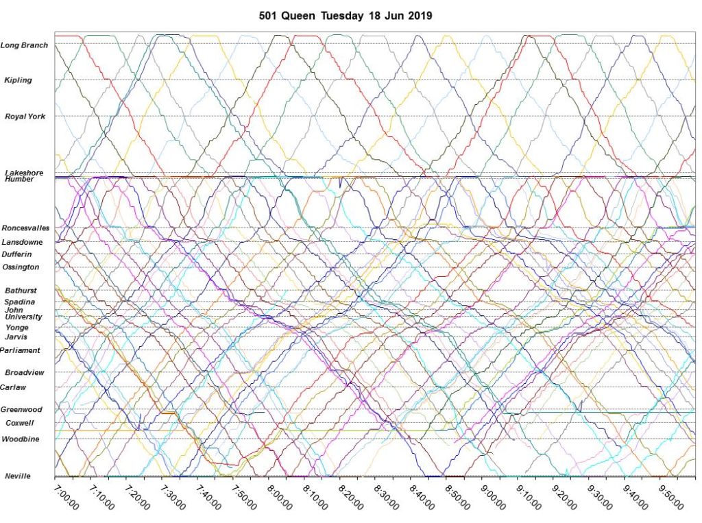 Lines sloping upward represent westbound cars, and those sloping down are eastbound. The times and locations are based on the schedule which is published in a standard format (“GTFS” or General Transit Feed Specification) by the TTC for each new schedule period.
