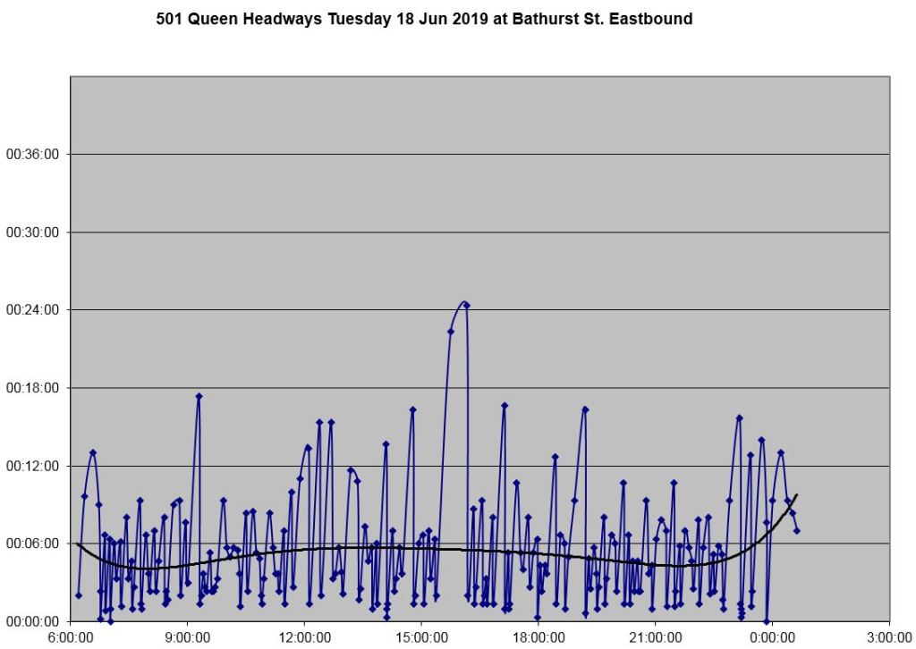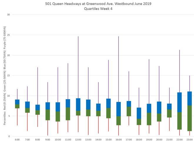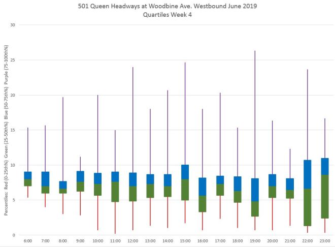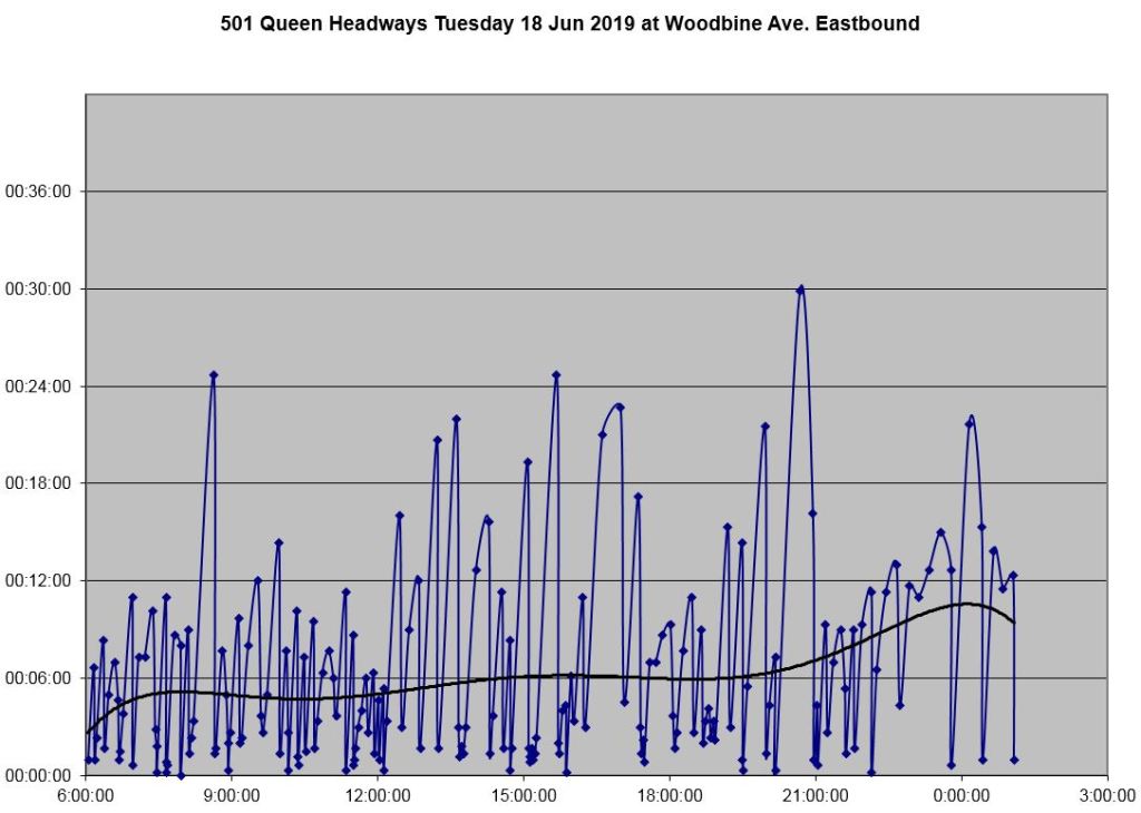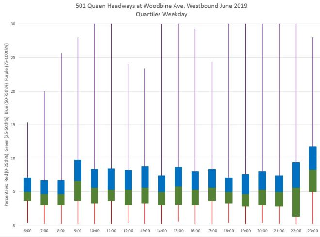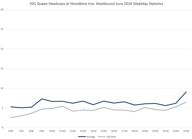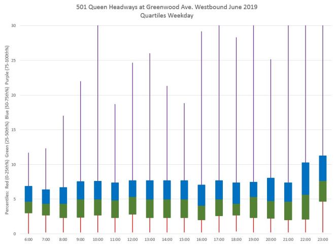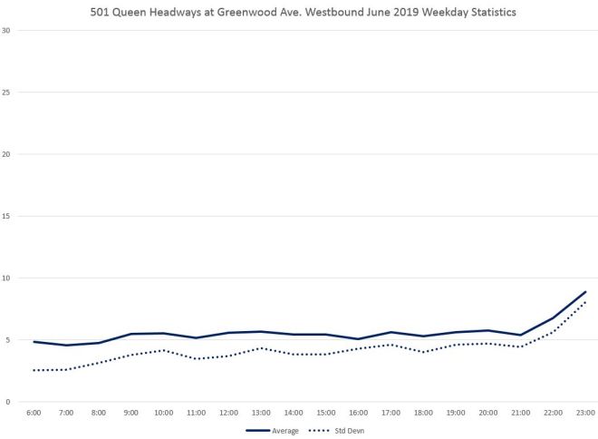 The chart below shows all trips westbound on Queen at two locations: Woodbine and Greenwood in June 2019. Time of day runs left to right, and the headway value bottom to top. Even without any formal statistical analysis, it is clear that most headways are smeared over a band from zero to ten minutes, and higher values are not uncommon.